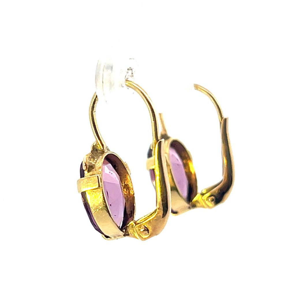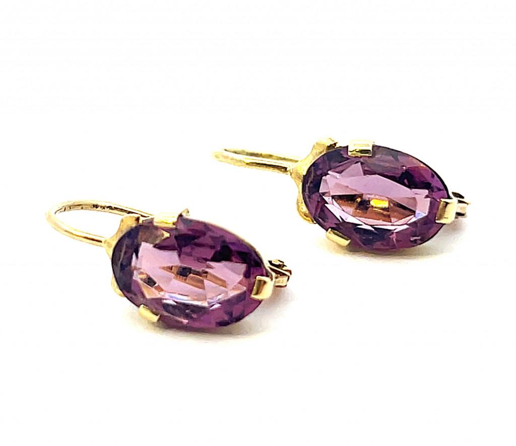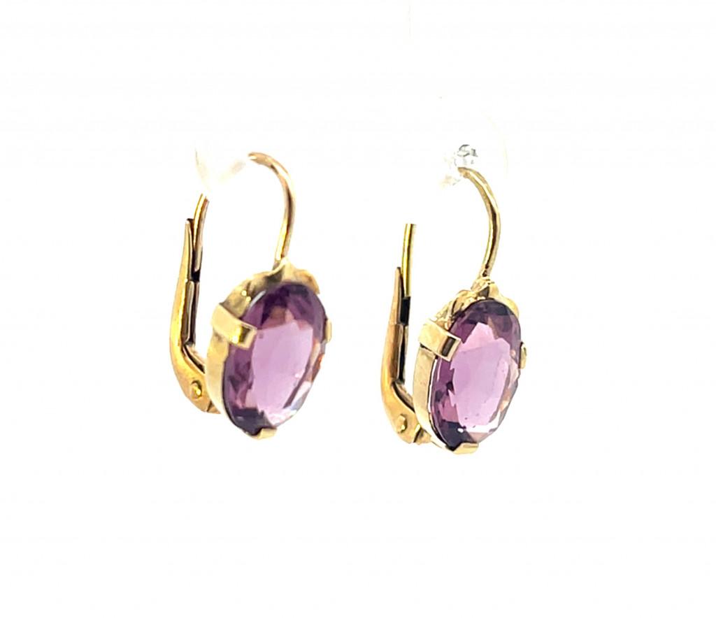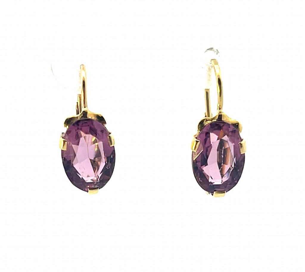 Zlaté náušnice s fialovými kamínky. Ryzost 585/1000 s puncem labuť. Váha 2,26 g, velikost kamene je 10 mm na délku a 7 mm na šířku. Celková délka náušnic je 18 mm. Kameny jsou syntetické.