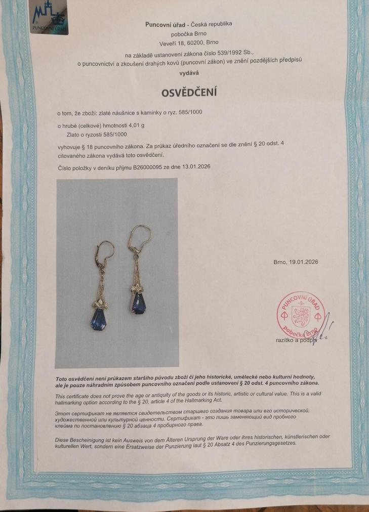 Náušice z kombinace žlutého a růžového zlata o ryzosti 585/1000, osvědčení z PÚ. Váha 4,01 g, výška 47 mm, v nejširším bodě 8 mm. Kameny jsou syntetické.