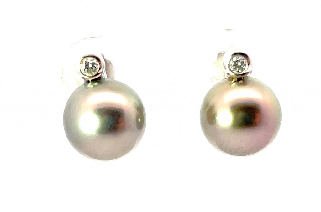 Elegantní náušnice z bílého zlata s černými perlami a diamanty napichovací na puzetu. Ryzost zlata 750/1000 s puncem kohout, váha 4,63 g. Čiré kameny jsou přírodní diamanty briliantového brusu a každý má cca 0,05 ct. Dohromady mají cca 0,10 ct. Průměr perel je 9 mm. Celkově měří náušnice na délku 13 mm.