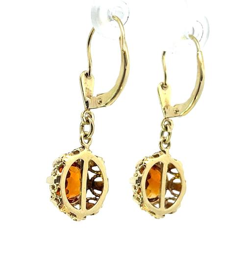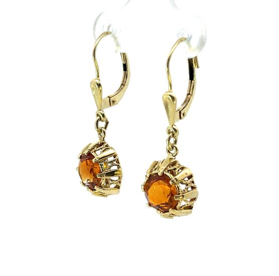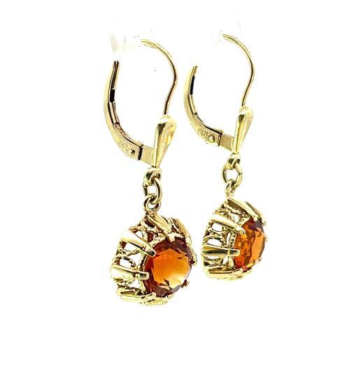 Zlaté náušnice o ryzosti 585/1000, punc labuť. Váha 3,75 g, výška 31 mm, průměr ozdoby 11 mm, průměr kamene 7 mm. Kameny jsou syntetické.
