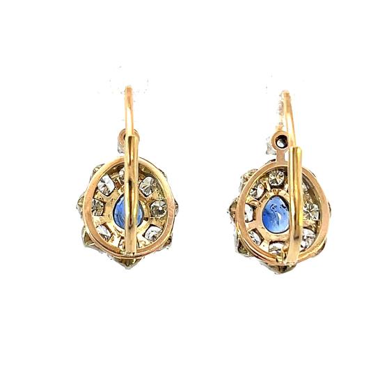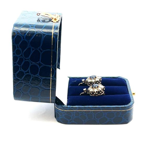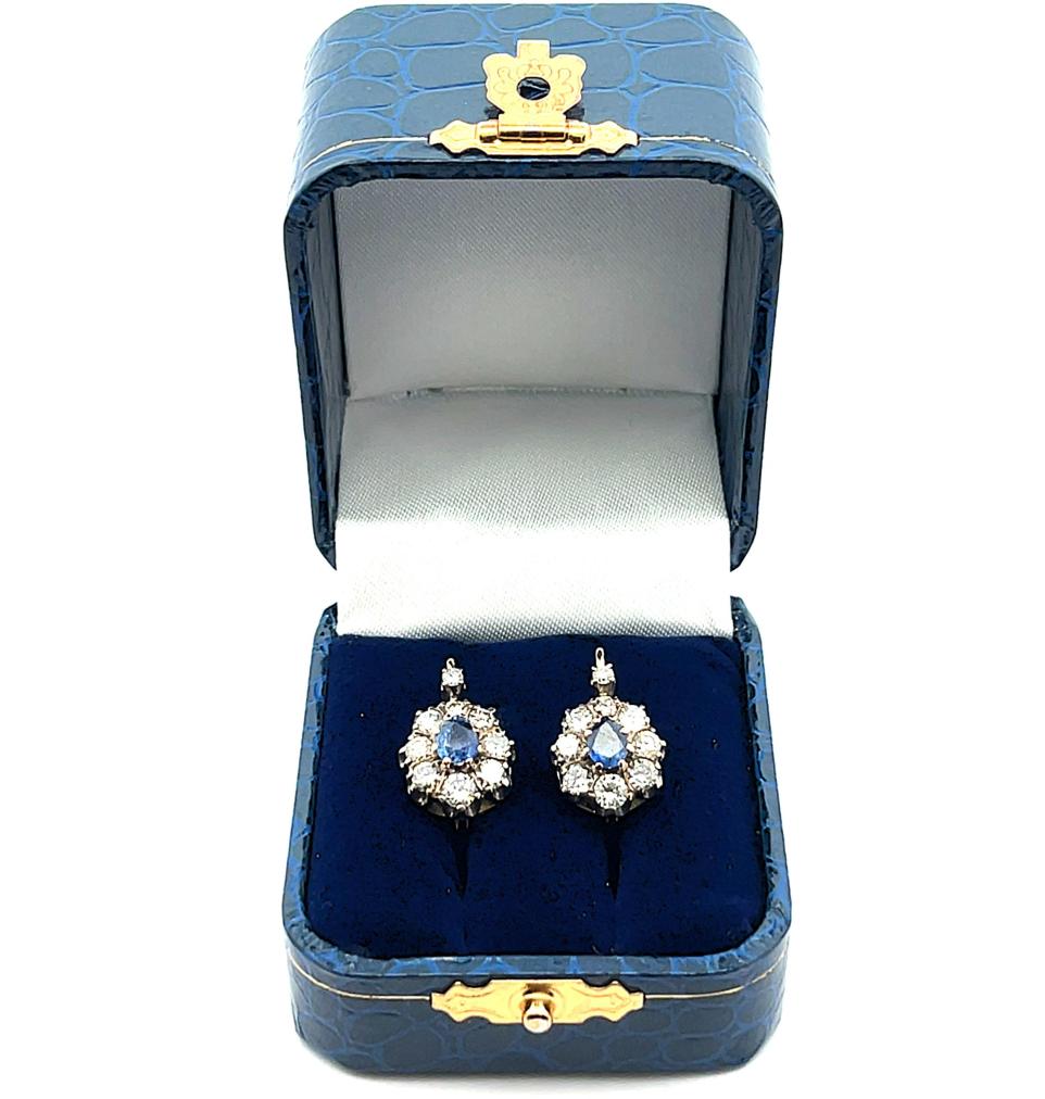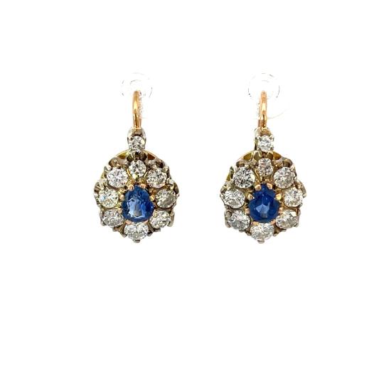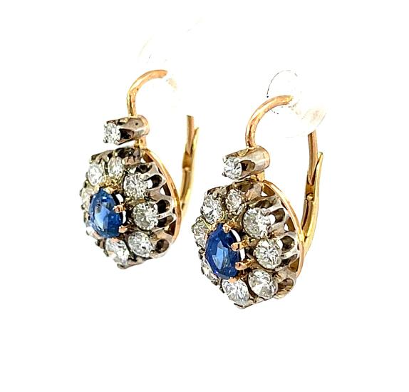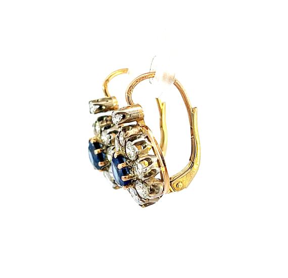 Náušnice z kombinace žlutého a bílého zlata o ryzosti 585/1000, punc labuť. Váha 4,34 g, výška 20 mm, v nejširším bodě 11,5 mm. Kámen - safír - 2 ks. Kámen - přírodní diamant briliantového brusu - 18 ks, dohromady cca 0,88 ct.