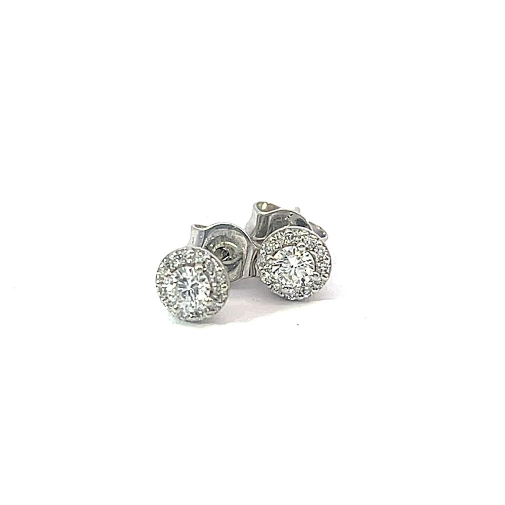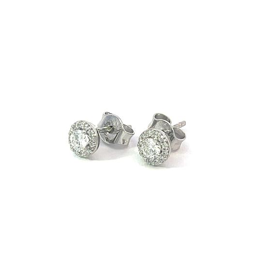 Náušnice z bílého zlta o ryzosti 585/1000, punc labuť. Váha 1,0 g, průměr ozdoby 5 mm. Kámen - přírodní diamant briliantového brusu - 26 ks, centrální kameny: 2 ks, cca 0,08 ct, okolní kameny: 24 ks, cca 0,005 ct každý - dohromady cca 0,28 ct.