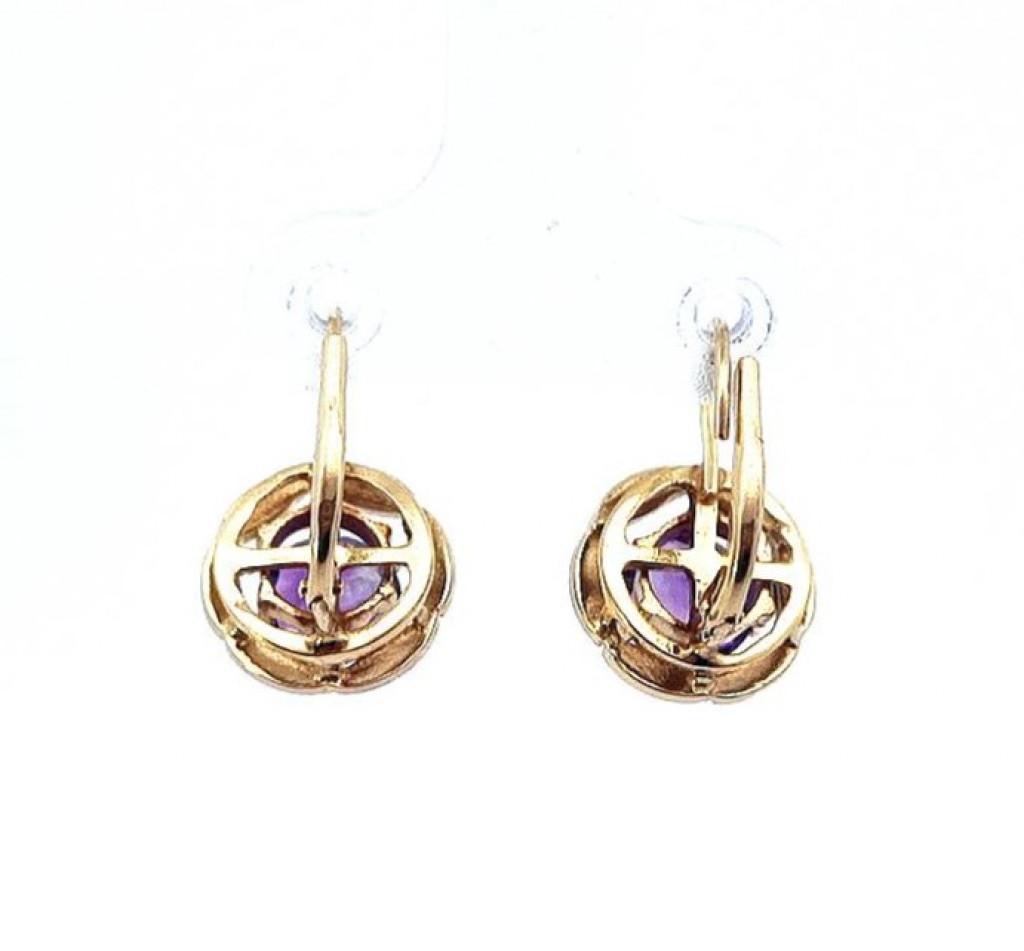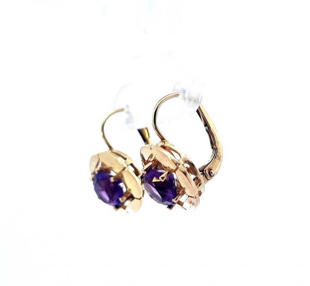 Zlaté náušnice s fialovým kamenem, visací. Žluté zlato o ryzosti 350/100, punc Z a slunce, váha 3,14 g, výška 16 mm, šířka 11 mm. Kámen je syntetický. Barva kamenů je světle fialová, foto zkresluje.