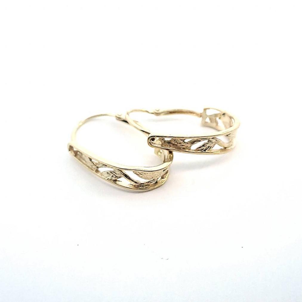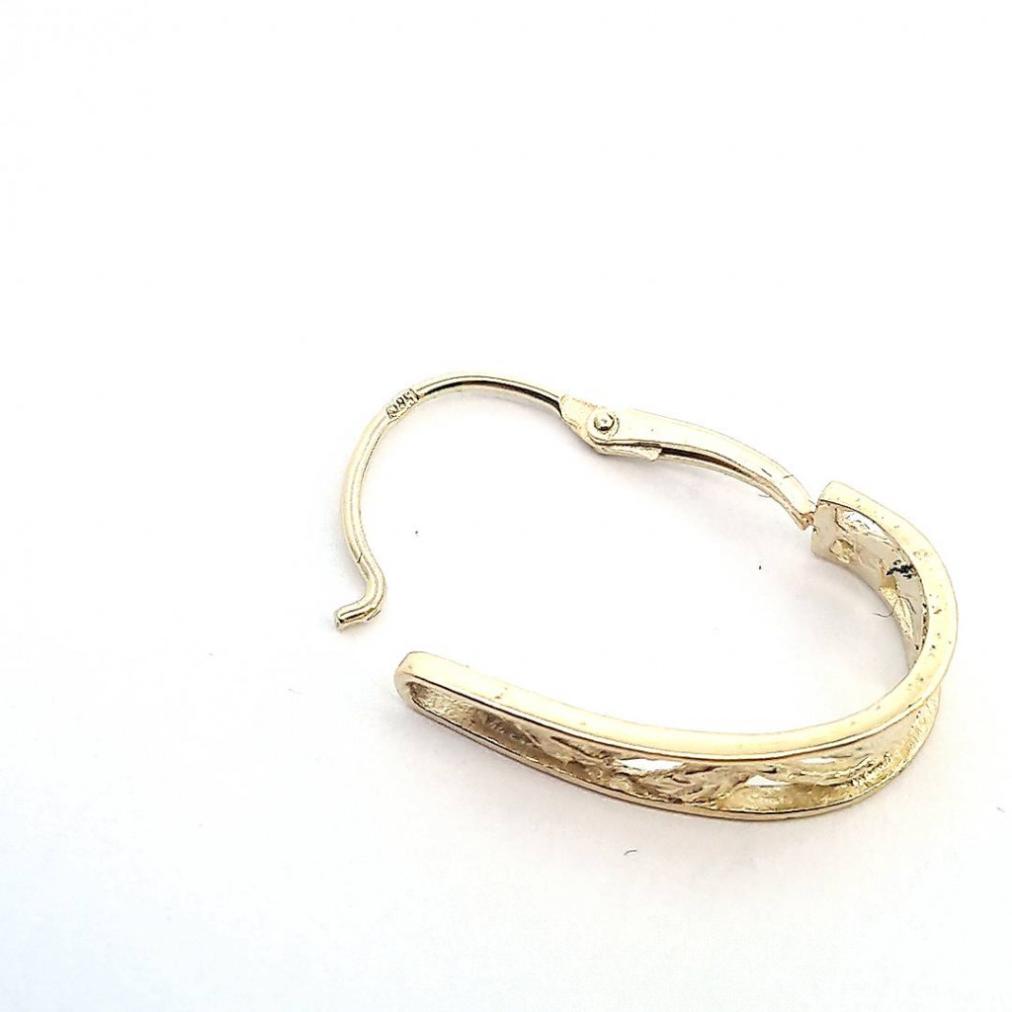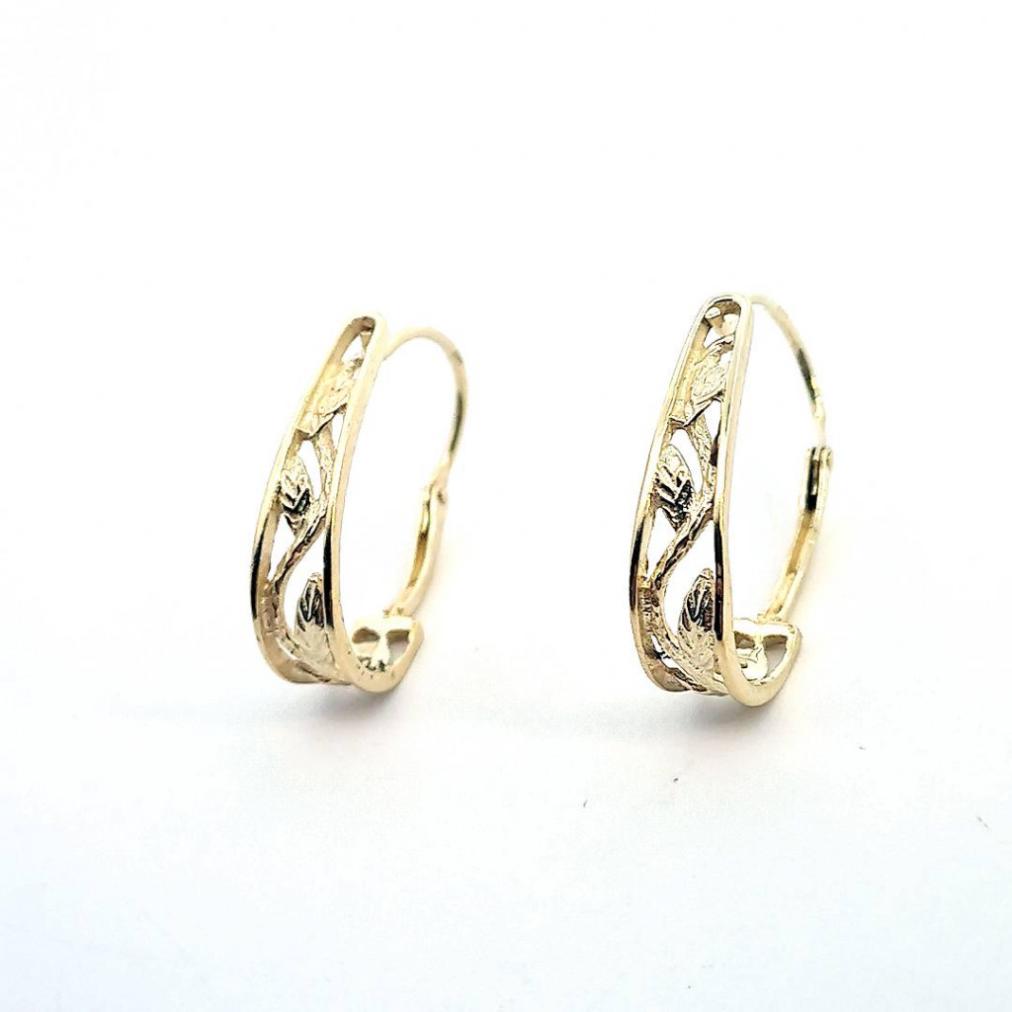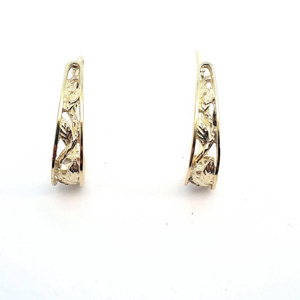 Náušnice ze žlutého zlata o ryzosti 585/1000 s puncem labuť. Půlkruhy jsou zdobené květinovým reliéfem, zapínání je přední. Celková výška závěsu je 20 mm. Náušnice váží 1,96 g.