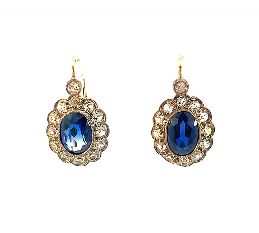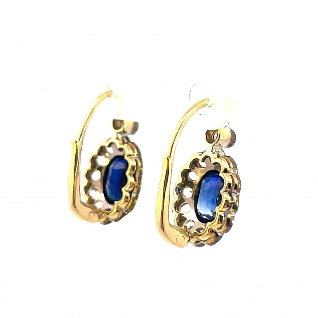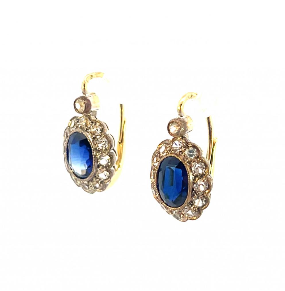 Starožitné zlaté náušnice s leukosafíry a modrými kameny. Zlato o ryzosti 585/1000 s puncem lvíček. Celková váha 3,37 g. Na výšku měří 19 mm, na šířku 10 mm. Rozměry největšího kamene jsou 8 x 5 mm. Průměr malých kamenů je 2 x 2 mm. Kameny jsou syntetické.