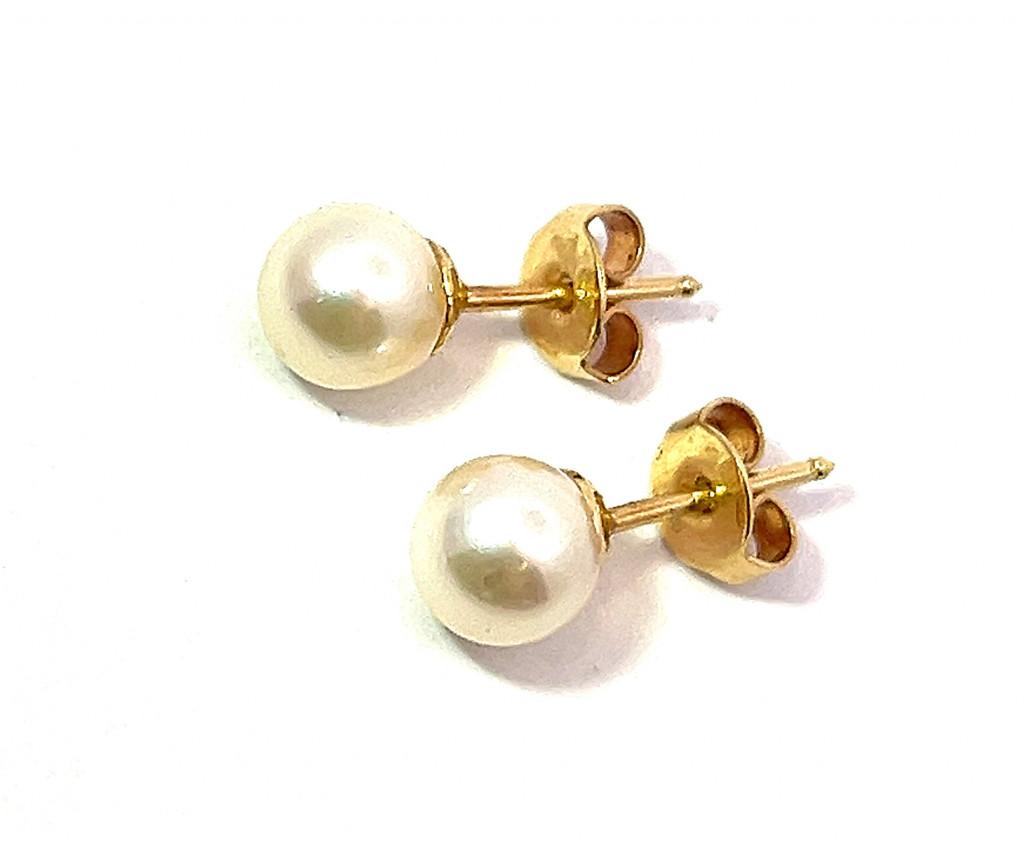 Jemné puzetové náušnice s perličkami. Zlato o ryzosti 750/1000. Váží 1,34 g. Perly mají průměr 6 mm.