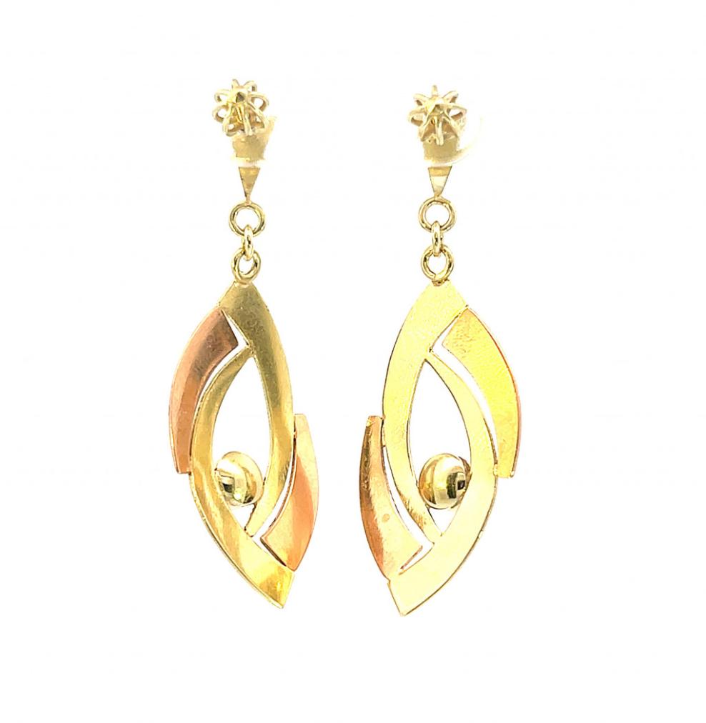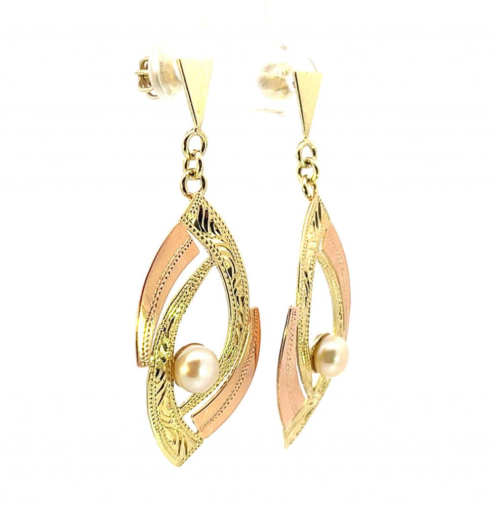 Náušnice z kombinace žlutého a růžového zlata o ryzosti 585/1000, punc labuť. Váha 4,90 g, výška 44 mm, v nejširším bodě 16,5, průměr perel 5 mm.