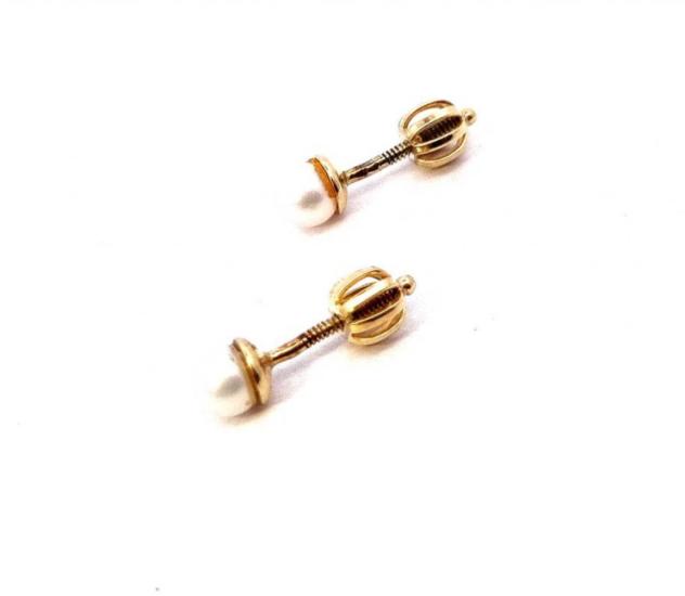 Zlaté náušnice s perličkou, šroubek. Váha 1,18 g, ryzost 585/1000, punc labuť. Průměr perly 4,5 mm.
