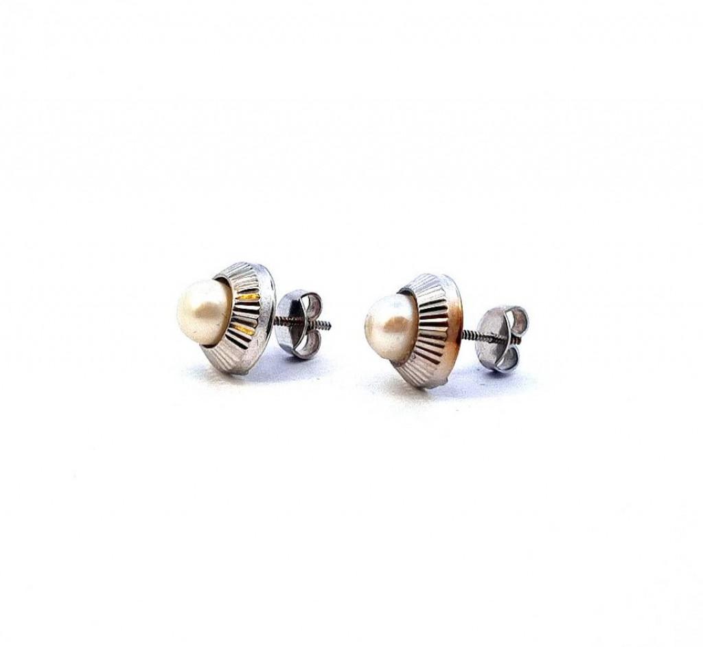 Náušnice z bílého zlata o ryzosti 585/1000, platný punc. Váha 1,95 g, průměr ozdoby 10 mm, průměr perly 6 mm.