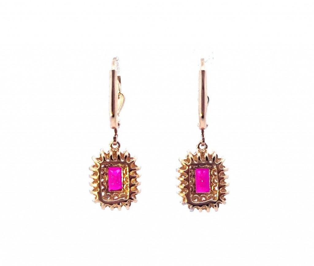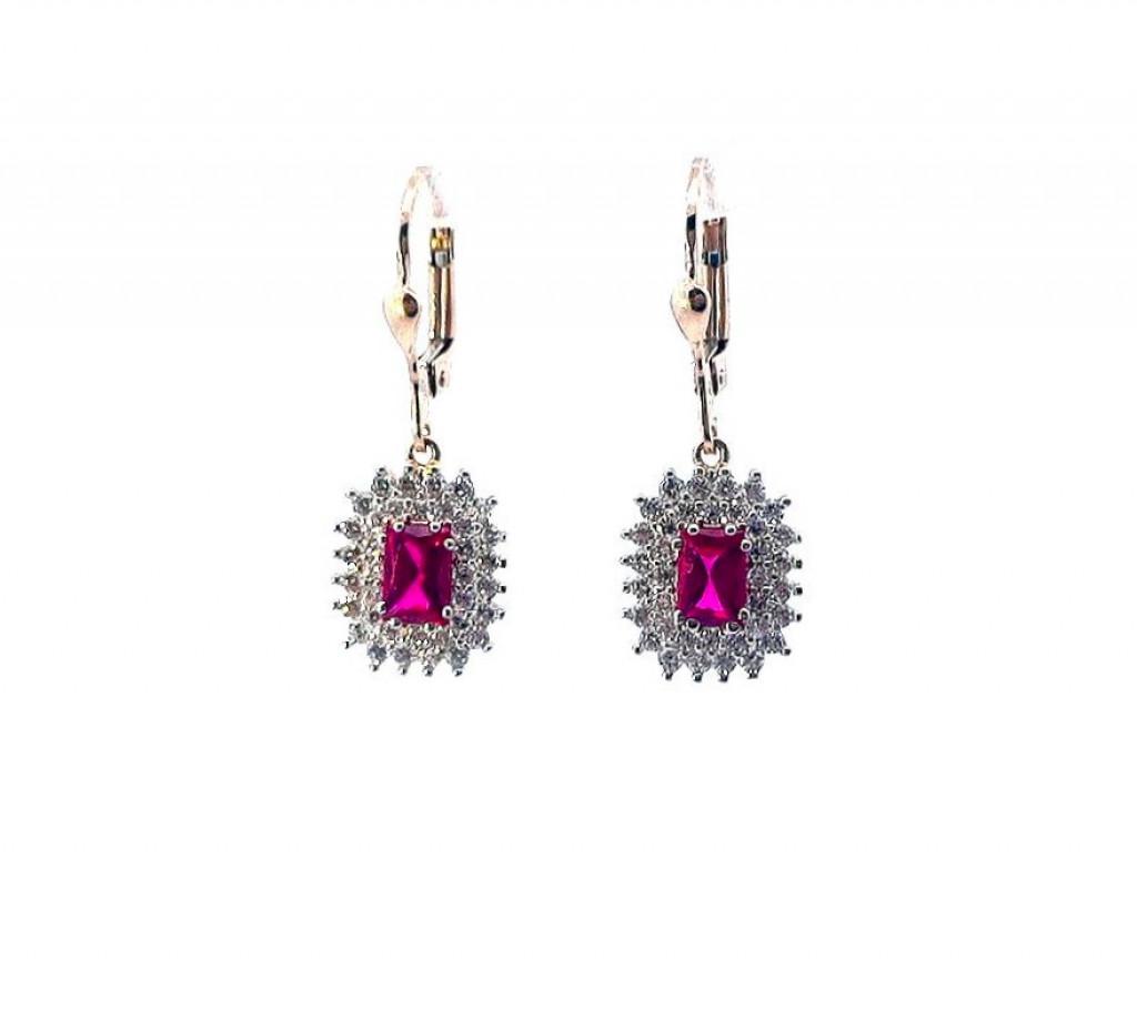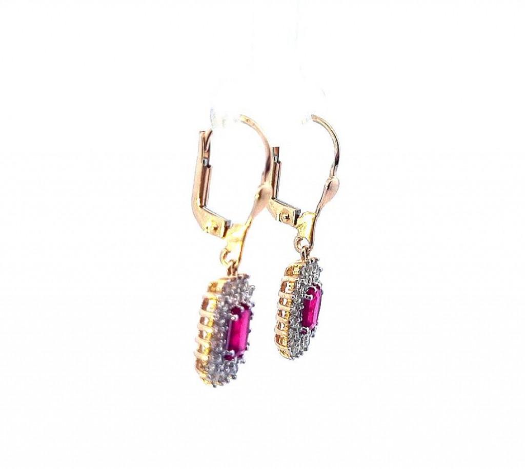 Zlaté náušnice o ryzosti 585/1000, punc labuť. Váha 4,09 g, výška 31 mm, v nejširším bodě 11 mm. Kameny jsou syntetické.
