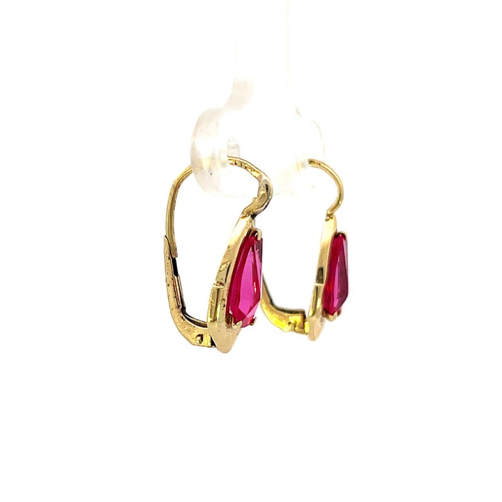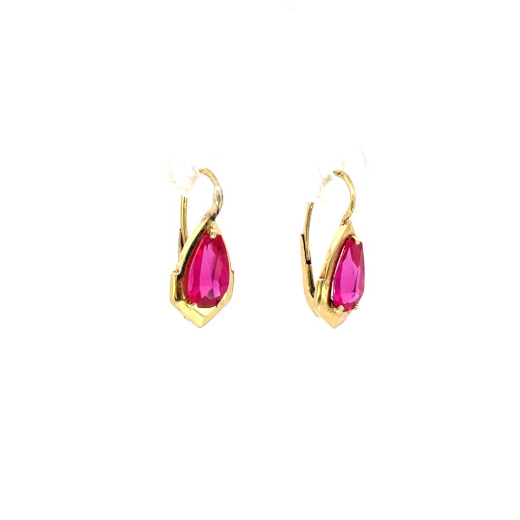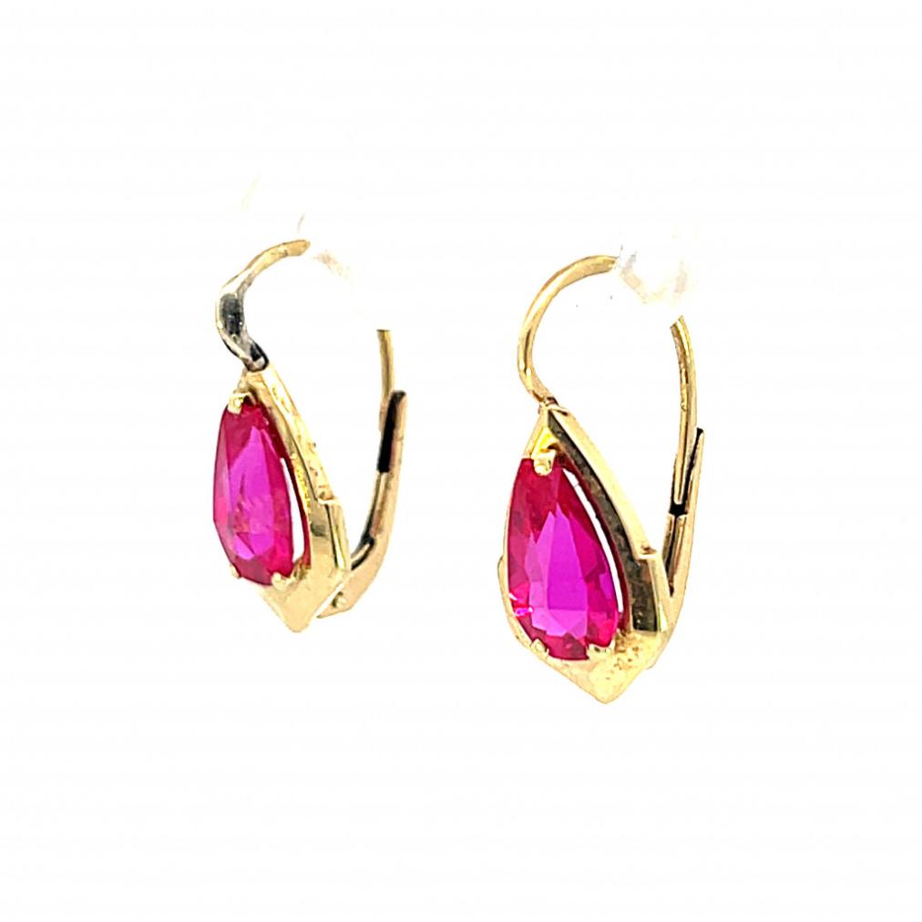 Zlaté náušnice o ryzosti 585/1000, punc labuť. Váha 1,64 g, výška 18 mm, v nejširším bodě 7,5 mm. Kameny jsou syntetické.