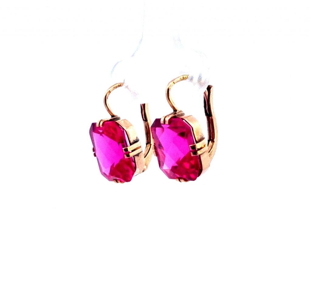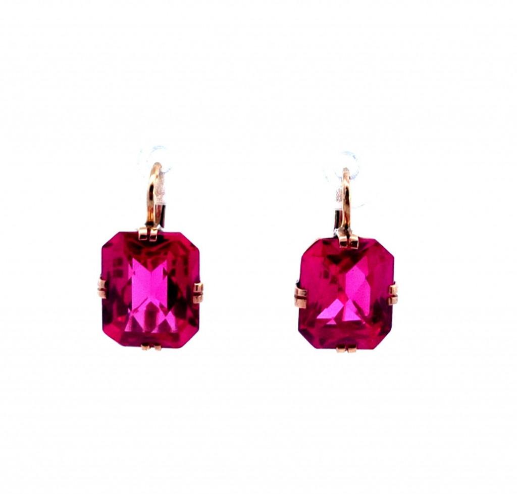 Náušnice z růžového zlata po ryzosti 585/1000, punc labuť. Váha 3,70 g, výška 17 mm, v nejširším bodě 9,5 mm. Kameny jsou syntetické.