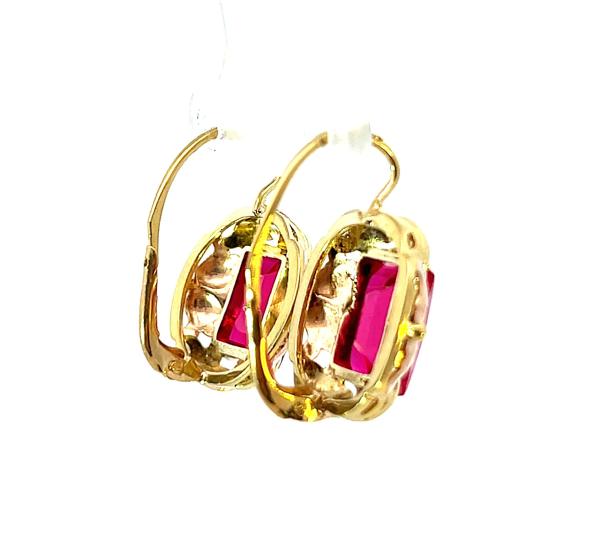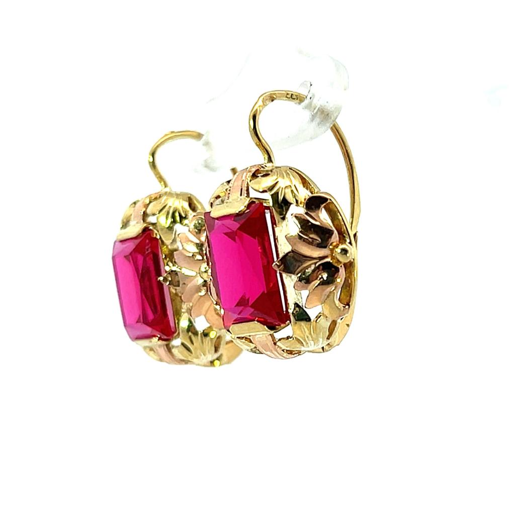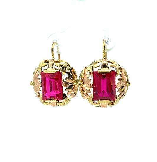 Náušnice z kombinace žlutého a růžového zlata o ryzosti 585/1000, punc čejka. Váha 6,99 g, výška 23 mm, průměr ozdoby 17,5 mm. Kámen je syntetický.