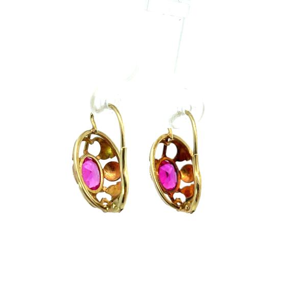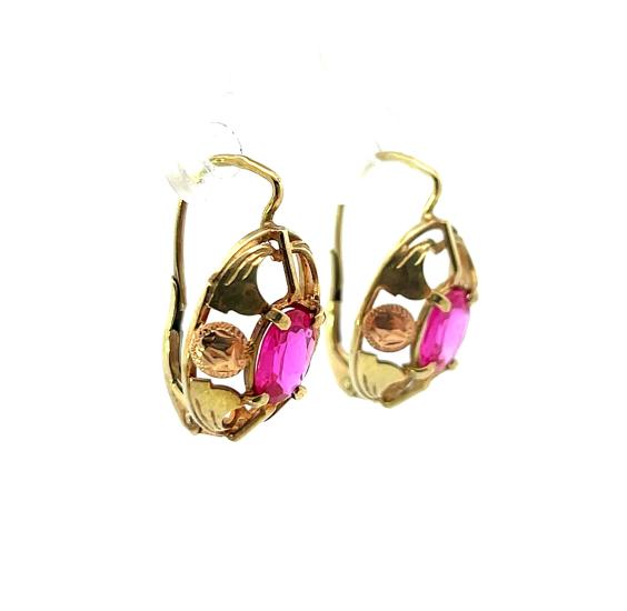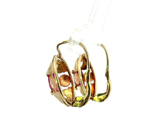 Náušnice z kombinace žlutého a růžového zlata o ryzosti 585/1000, punc labuť. Váha 3,70 g, výška 20 mm, v nejširším bodě 11,5 mm. Kameny jsou syntetické.