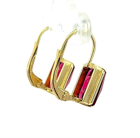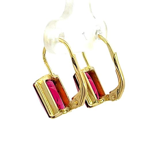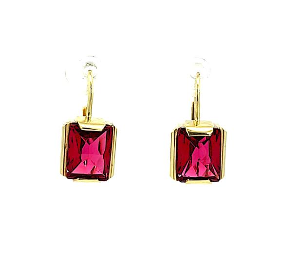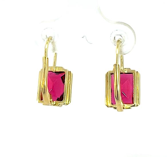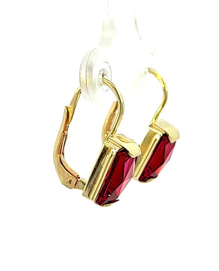 Zlaté náušnice o ryzosti 585/1000, punc čejka a labuť (jeden kus byl dopuncován dodatečně). Váha 3,64 g, výška 18 mm, v nejširším bodě 8,5 mm. Kameny jsou syntetické.