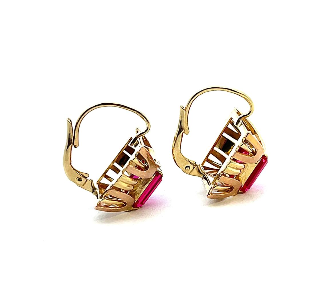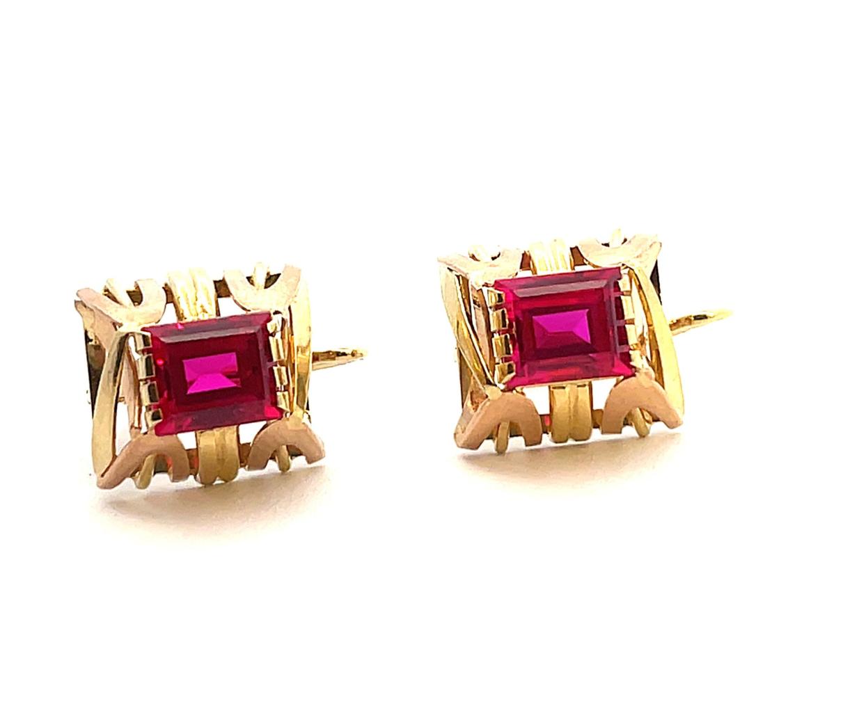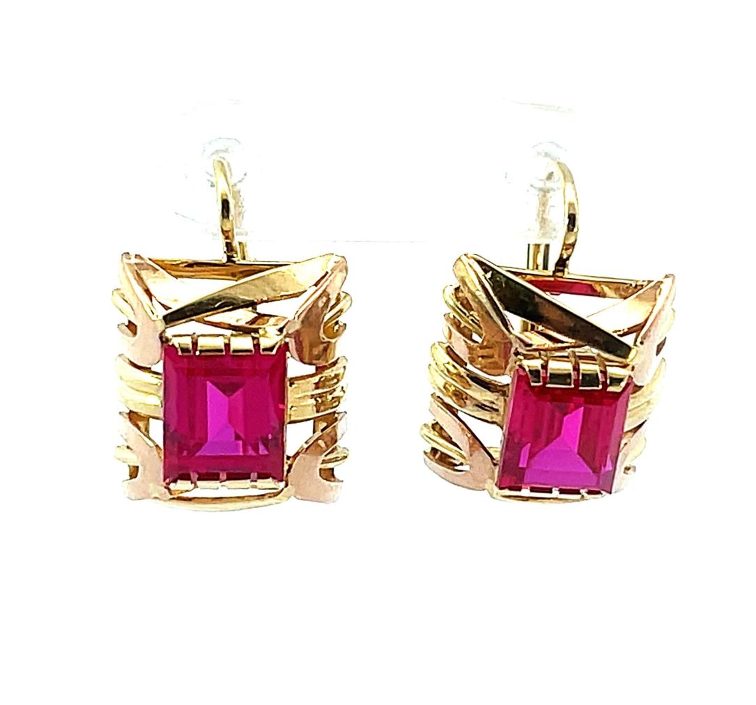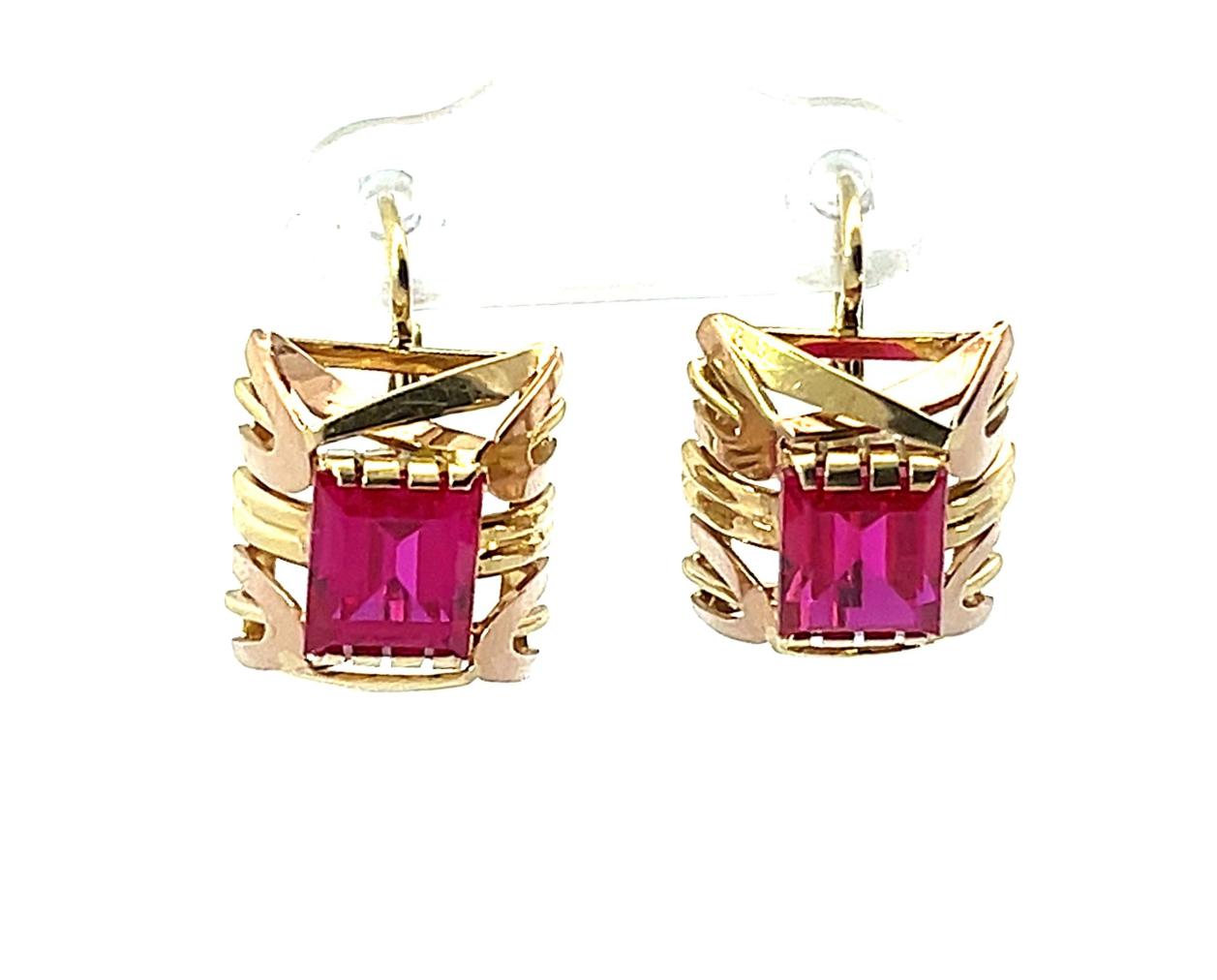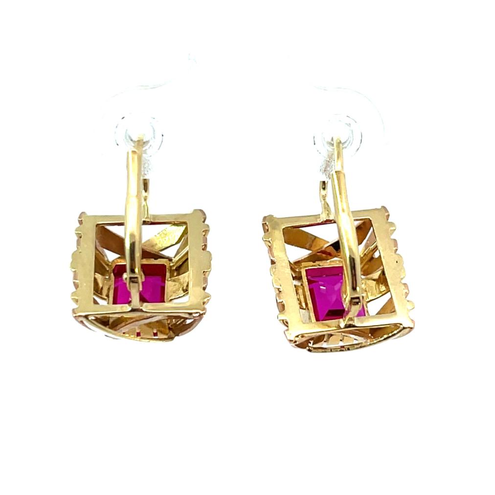 Náušnice z kombinace žlutého a růžového zlata o ryzosti 585/1000, punc čejka. Váha 4,84 g, výška 18 mm, rozměr ozdobné části 12,5 x 12 mm. Kameny jsou syntetické.