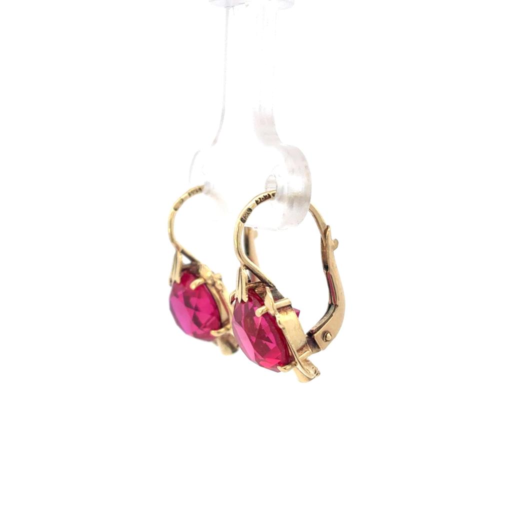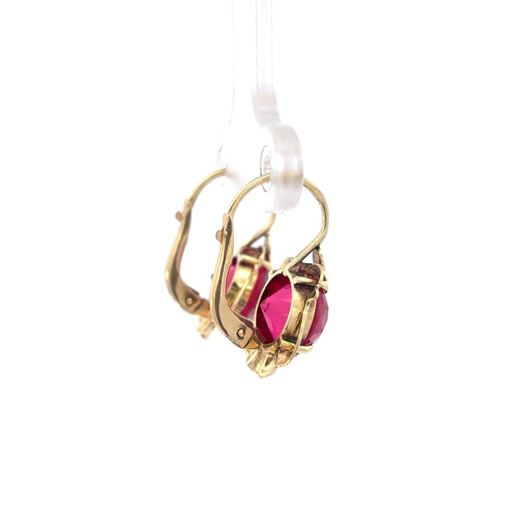 Zlaté náušnice o ryzosti 585/1000, punc čejka. Váha 3,08 g, výška 18,5 mm, rozměr ozdobné části 11 x 13 mm. Kameny jsou syntetické.