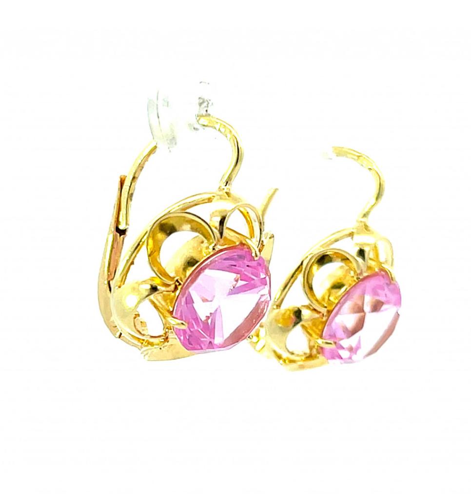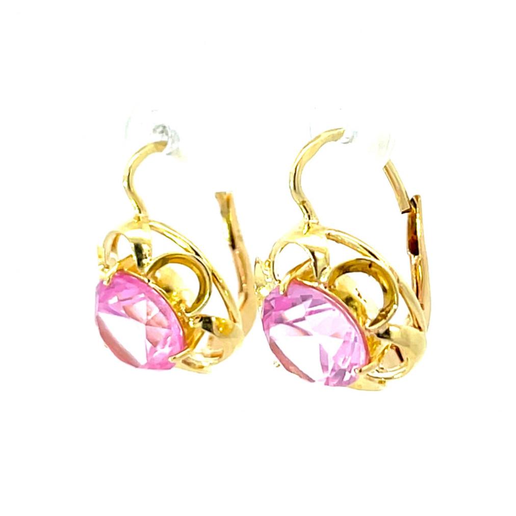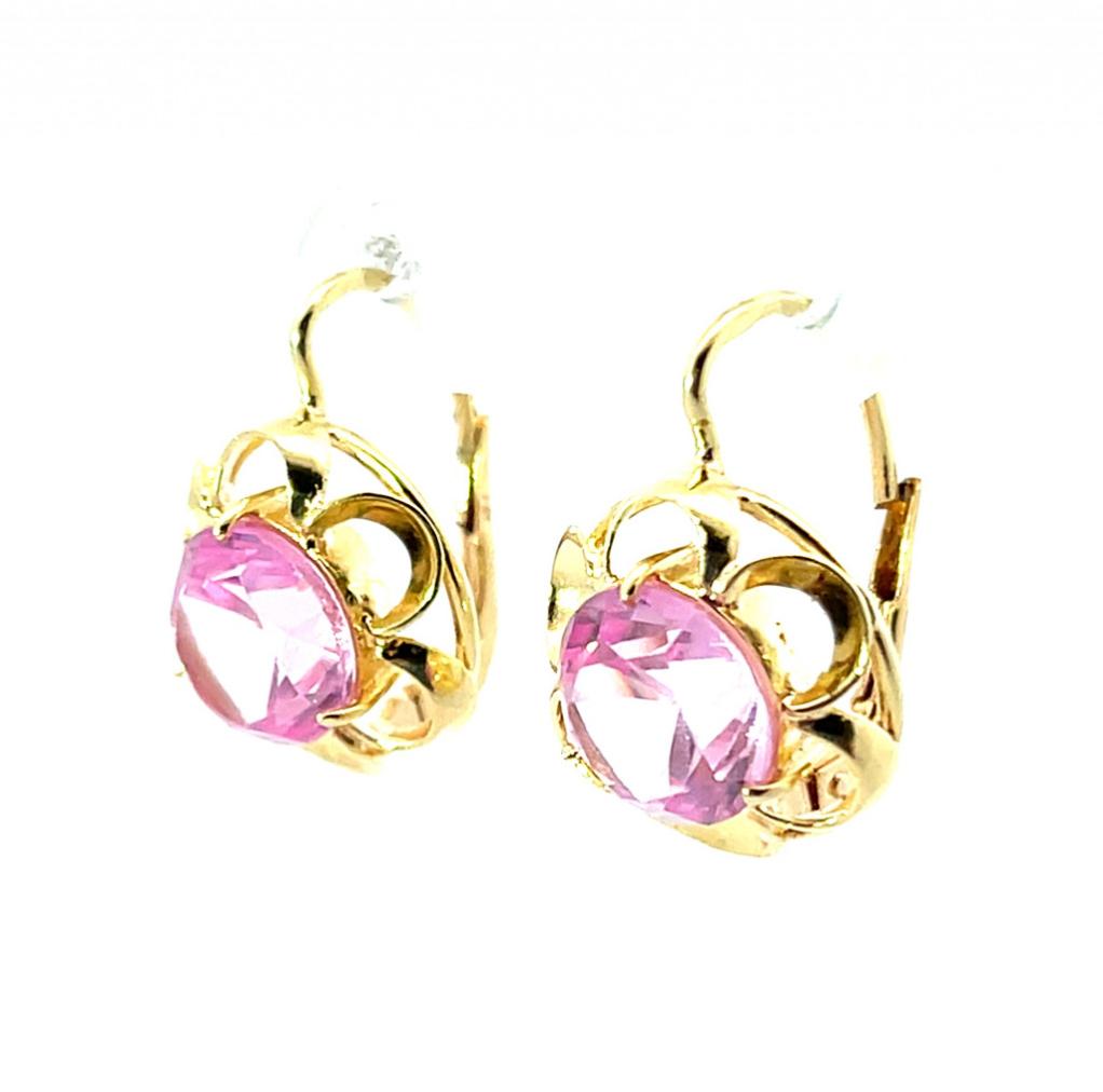Zlaté náušnice o ryzosti 585/1000, punc čejka. Váha 4,09 g, výška 18 mm, průměr ozdoby 13,5 mm, průměr kamene 8 mm. Kameny jsou syntetické.
