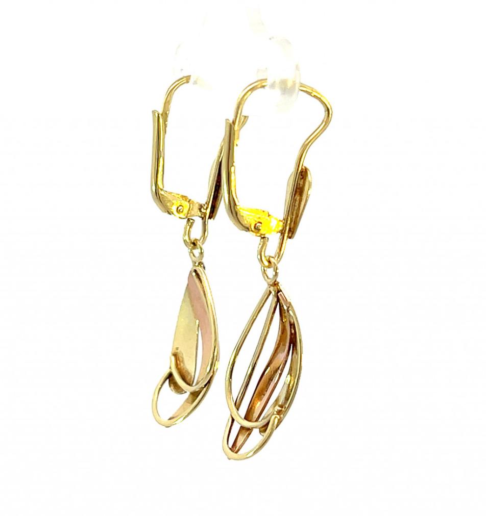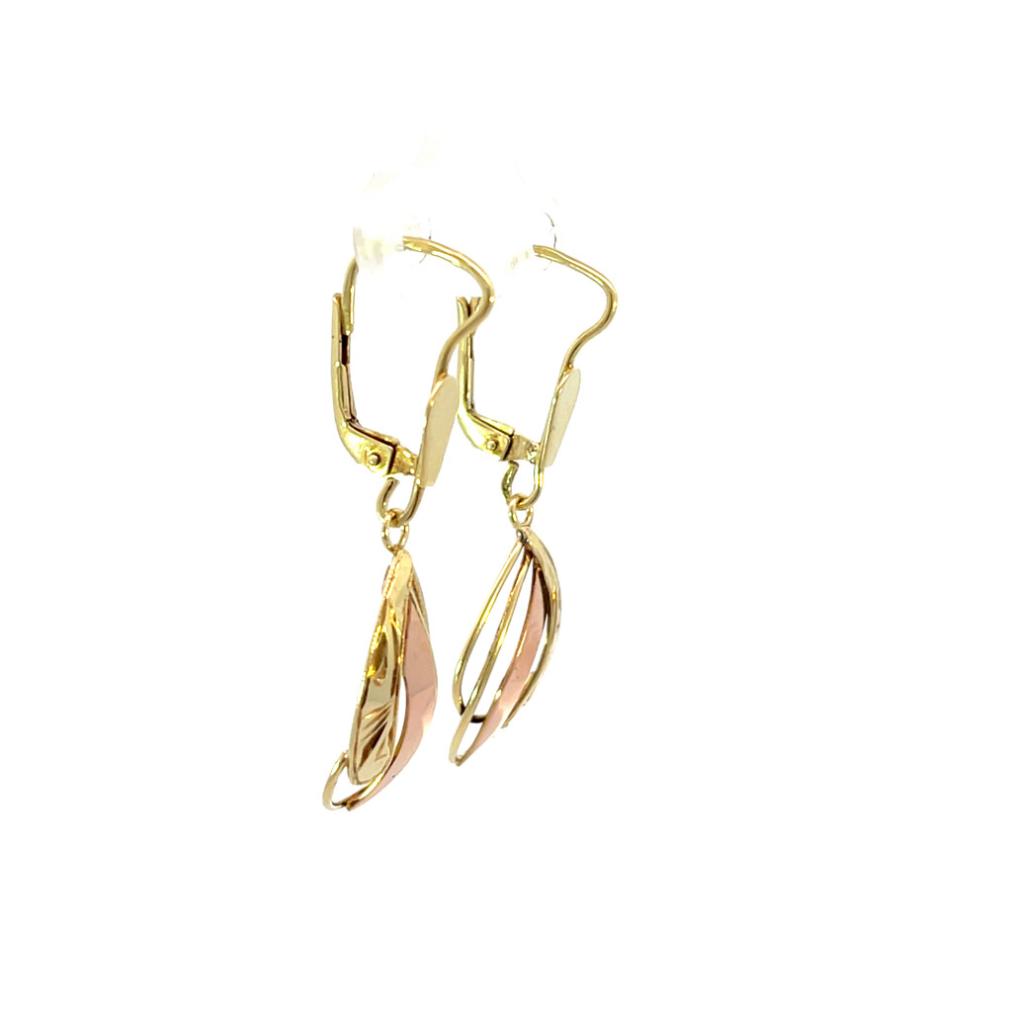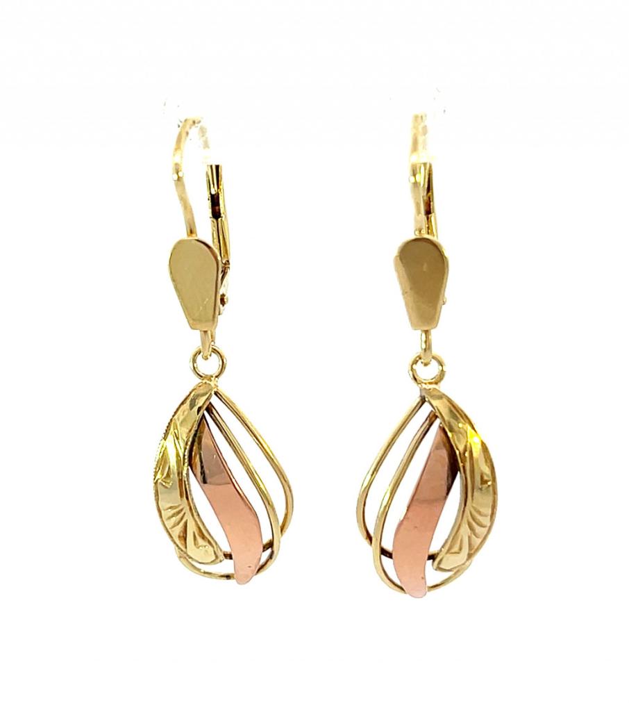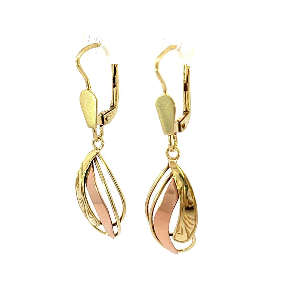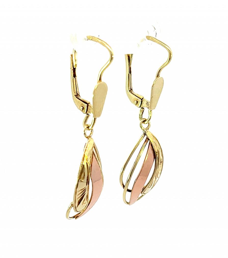Elegantní zlaté náušnice v kombinaci žlutého a růžového zlata o ryzosti 585/1000 s puncem labuť. Váha 3,13 g, celková výška je 39 mm, rozměry ozdobné části jsou 19 x 11 mm.