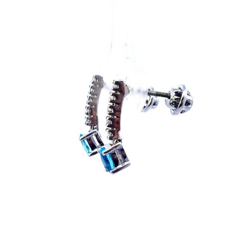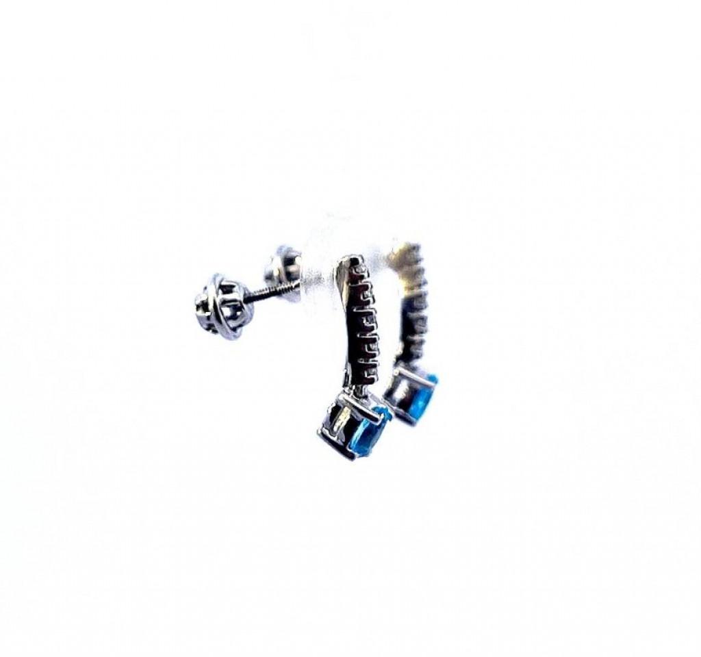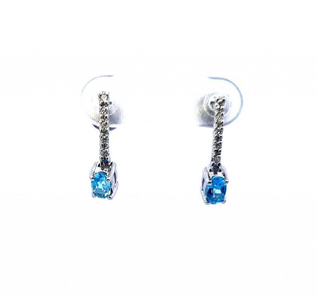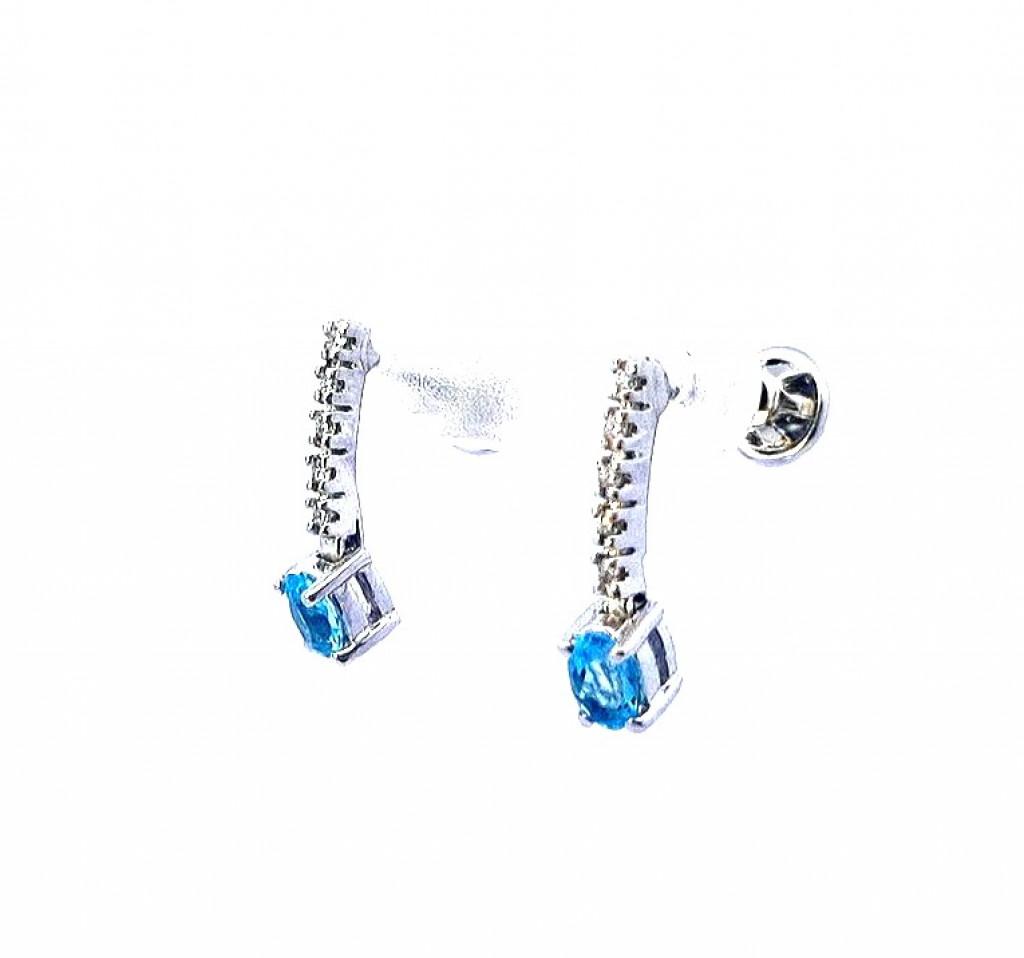 Zlaté náušnice o ryzosti 585/1000, punc labuť. Váha 2,30 g, výška 15 mm, rozměr topazu 5 x 3 mm. Kámen - přírodní topaz - 2 ks. Kámen - přírodní diamant briliantového brusu - celkem 10 ks, dohromady cca 0,05 ct.