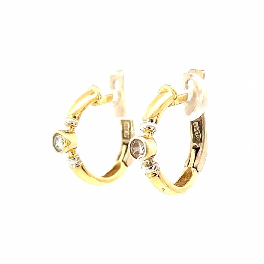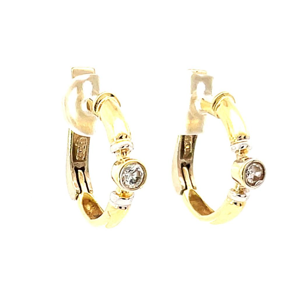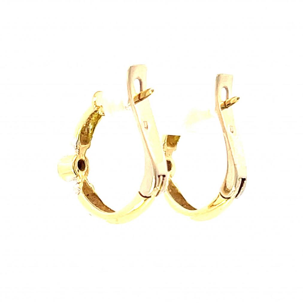 Náušnice ze žlutého zlata o ryzosti 585/1000 s puncem labutě. Silnější kroužek zdobí jeden zirkon o průměru 3 mm. Jeden z kamínků je poškozený u okraje zasazení. Váha náušnic je 3,93 g, průměr kruhu je 18 mm.