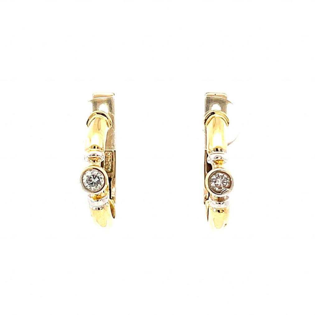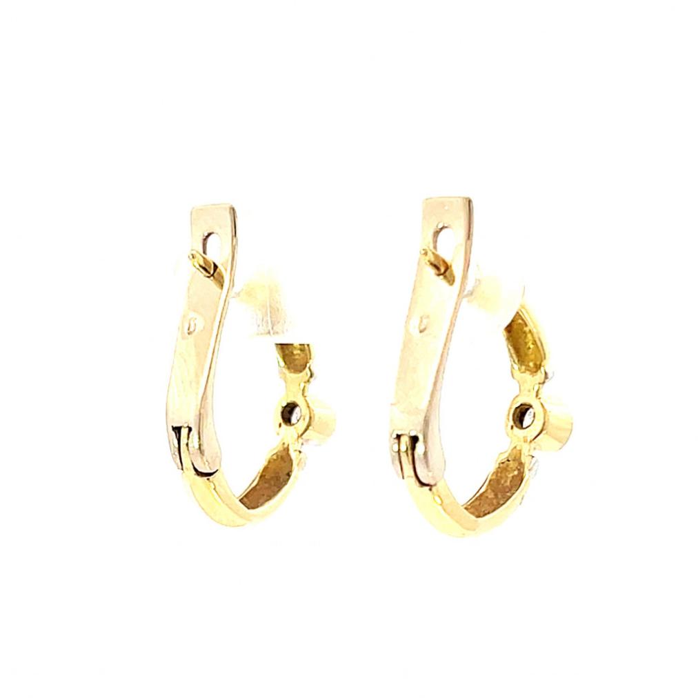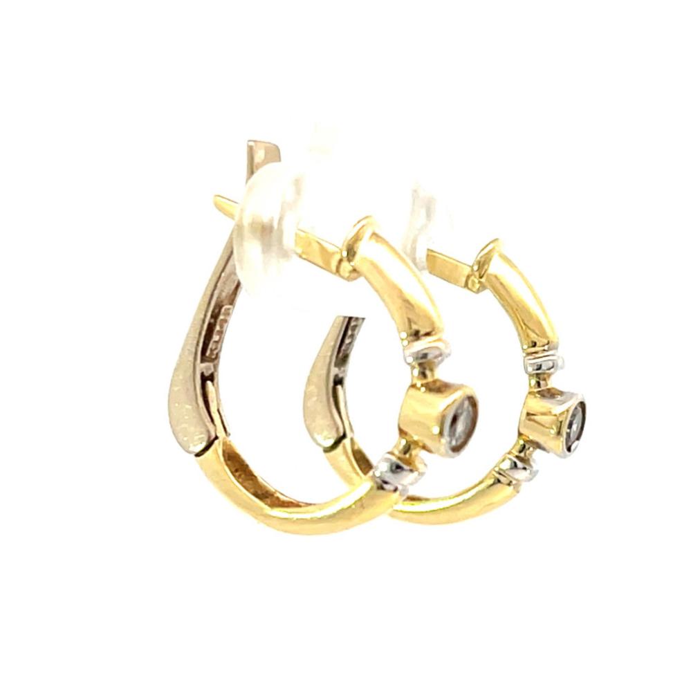Náušnice ze žlutého zlata o ryzosti 585/1000 s puncem labutě. Silnější kroužek zdobí jeden zirkon o průměru 3 mm. Jeden z kamínků je poškozený u okraje zasazení. Váha náušnic je 3,93 g, průměr kruhu je 18 mm.