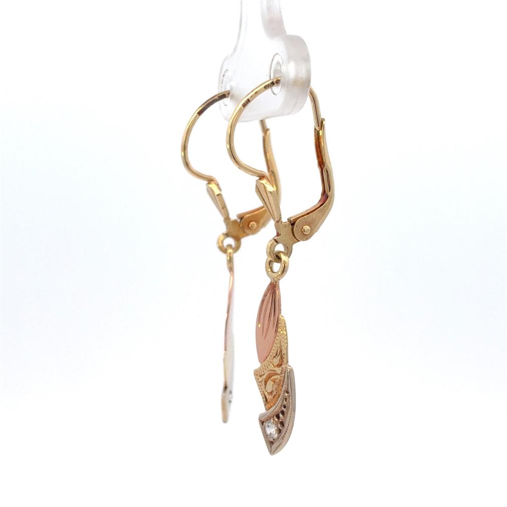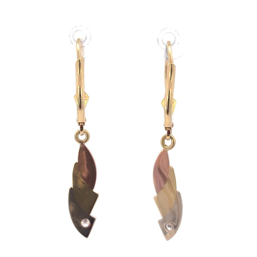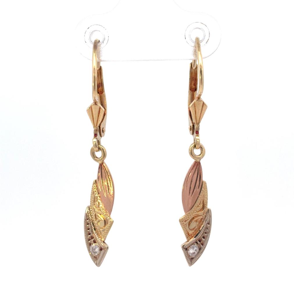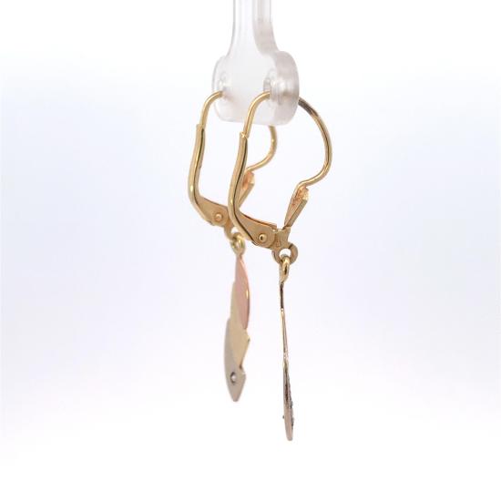 Náušnice z kombinace žlutého, růžového a bílého zlata o ryzosti 585/1000, punc labuť. Váha 2,27 g, výška 39,5 mm, v nejširším bodě 6 mm.