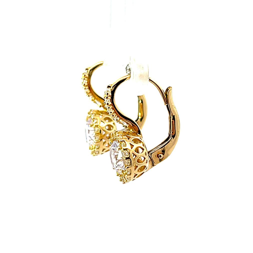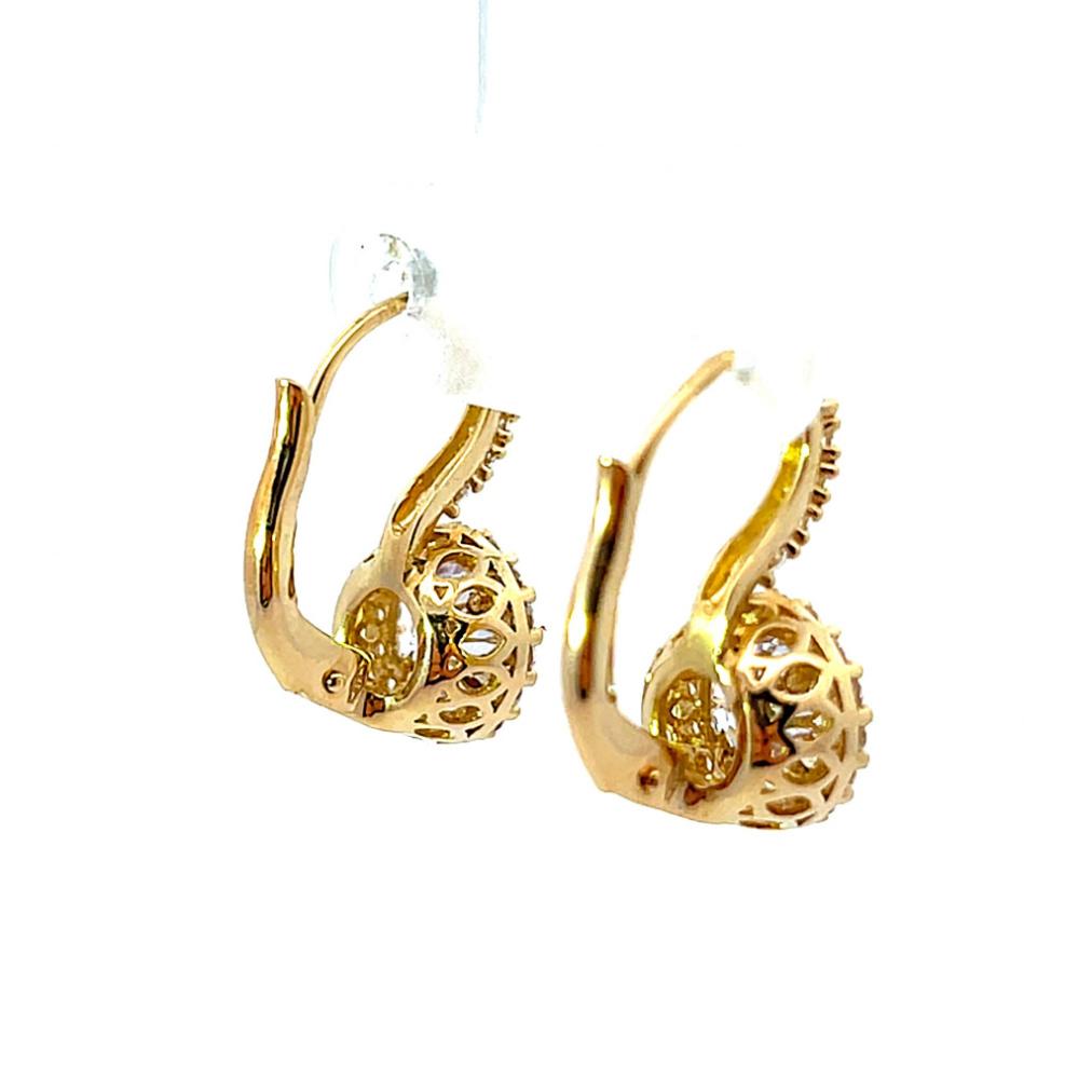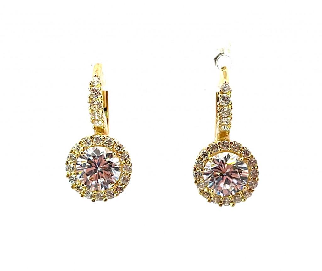 Zdobené zlaté náušnice poseté zirkony o ryzosti 585/1000 s puncem labuť. Váha 3,41 g, na výšku měří 18 mm, šířka 10 mm. Nejmenší zirkony mají průměr 1 mm, větší 2 mm a dva největší mají každý průměr 6 mm. Kameny jsou syntetické.