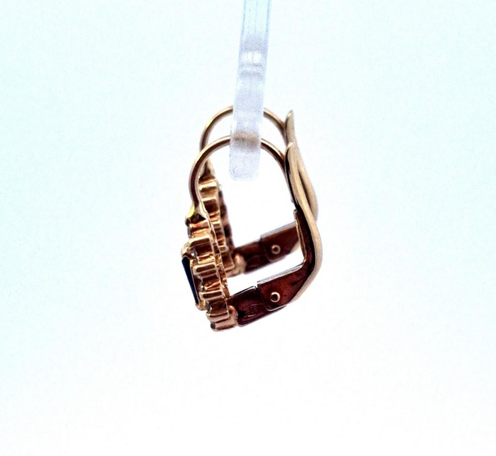 Zlaté náušnice o ryzosti 585/1000, punc labuť. Váha 2,45 g, výška 16 mm, v nejširším bodě 7,5 mm. Kameny jsou syntetické.
