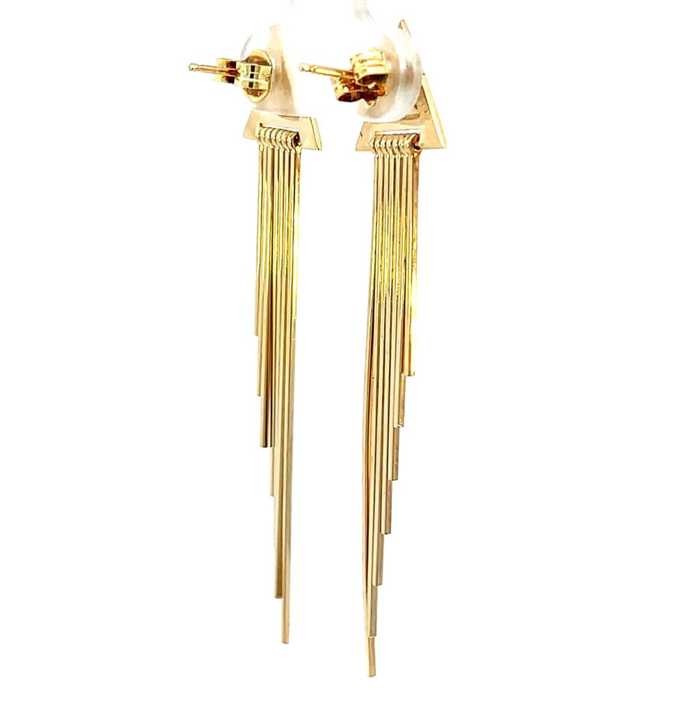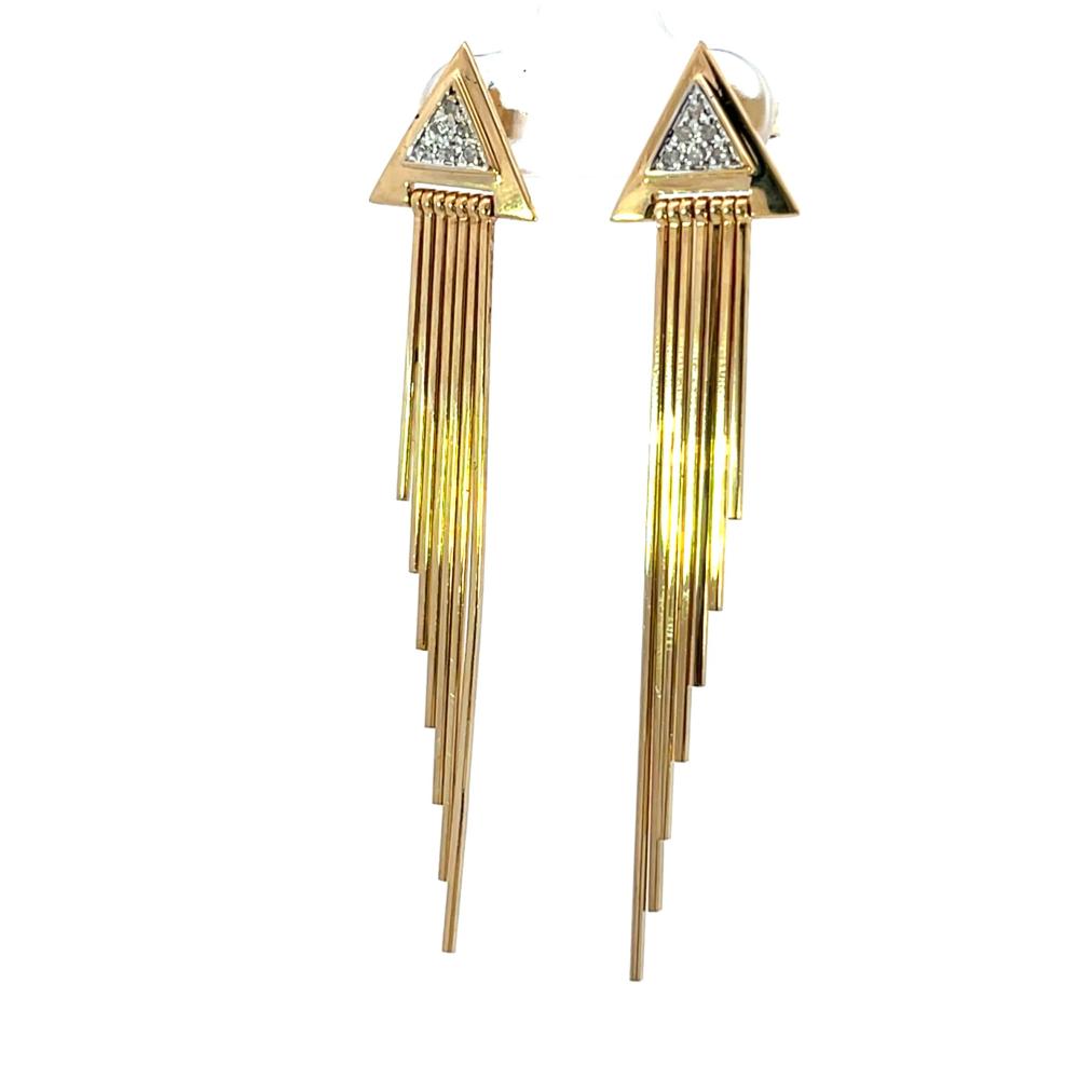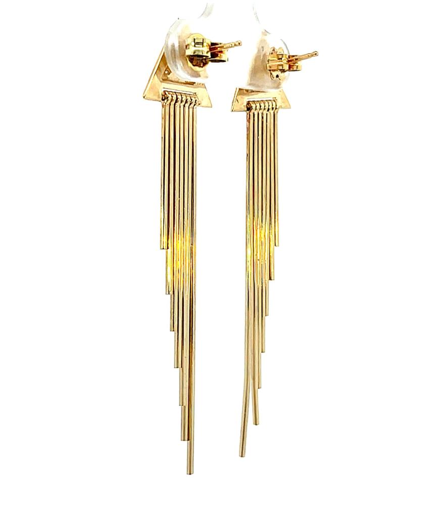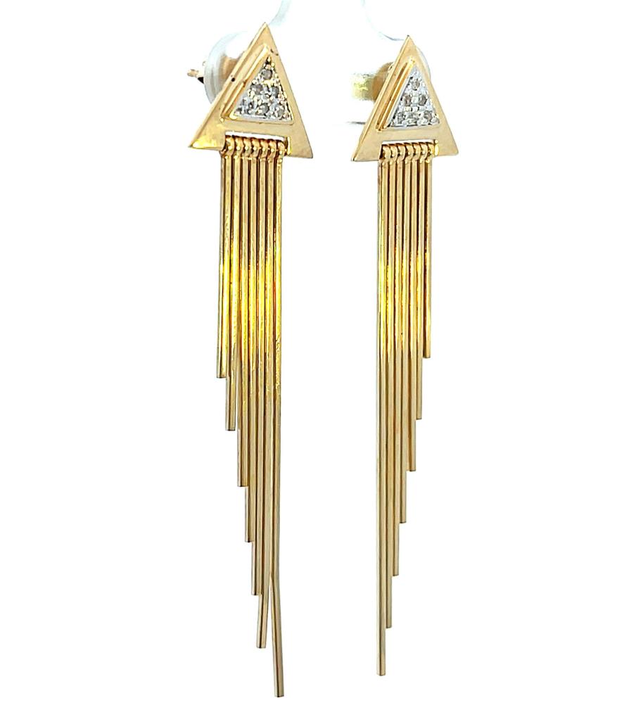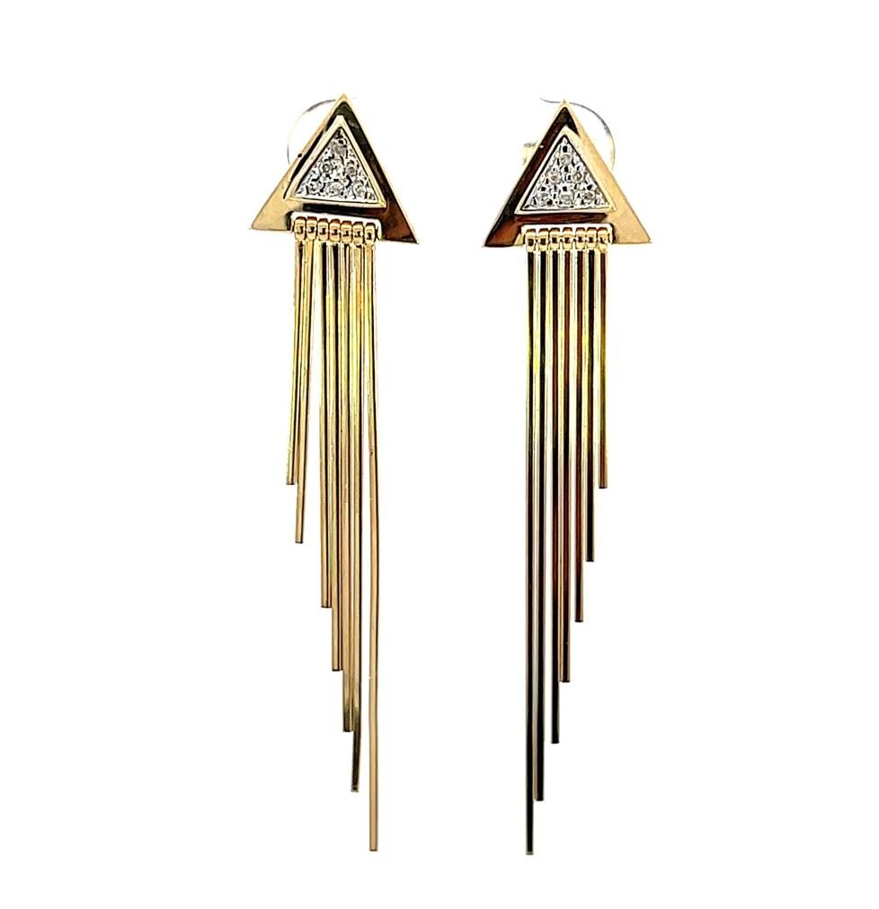 Zlaté náušnice o ryzosti 585/1000, punc labuť. Váha 6,04 g, výška 59 mm, v nejširším bodě 13 mm. Kameny jsou syntetické.