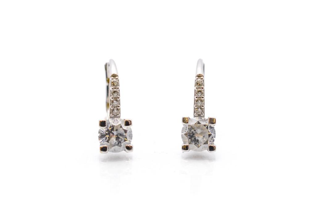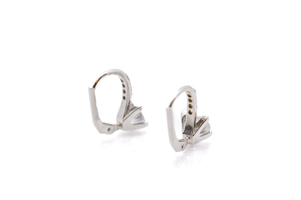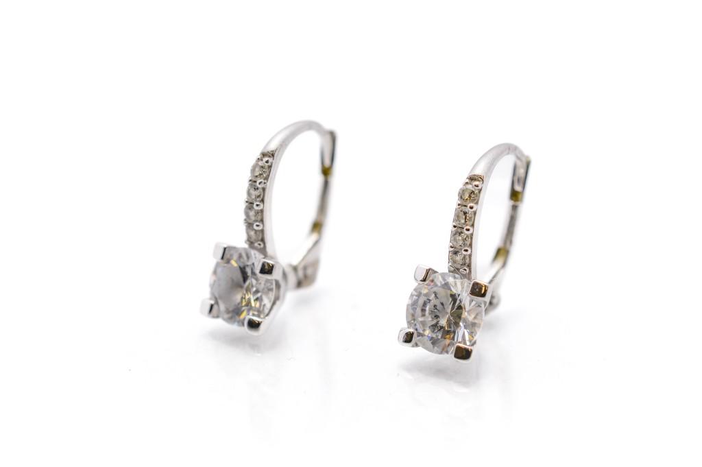 Zlaté náušnice z bílého zlata o ryzosti 585/1000, punc labuť. Váha 2,71 g, výška 16 mm, průměr kamene 6 mm.