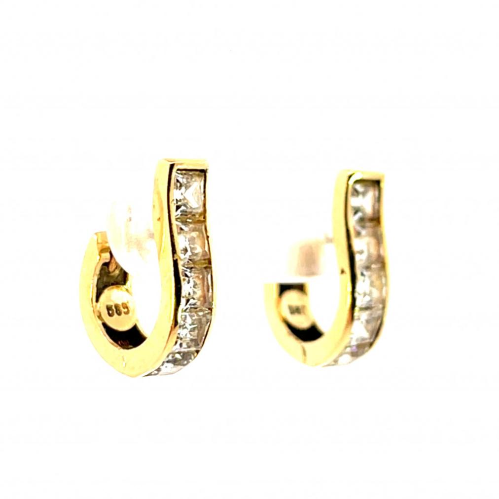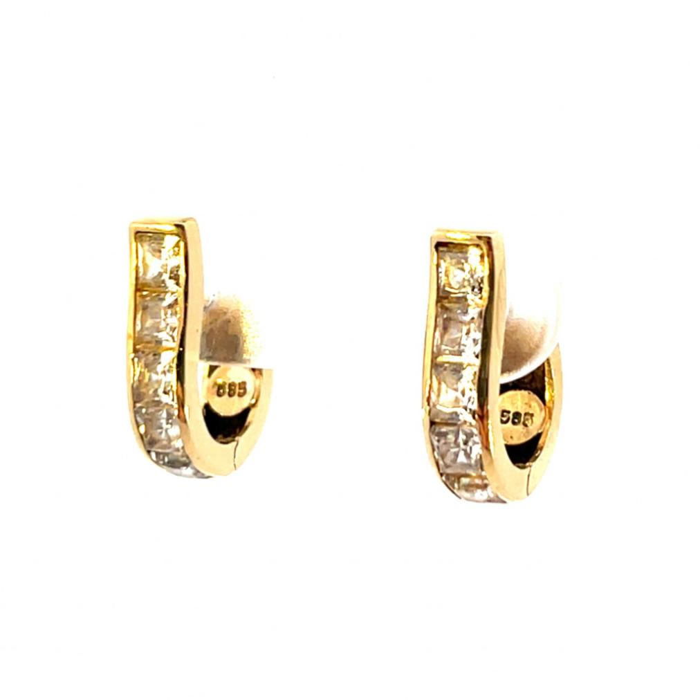 Zlaté náušnice o ryzosti 585/1000, punc labuť. Váha 2,78 g, výška 15 mm, v nejširším bodě 4 mm.
