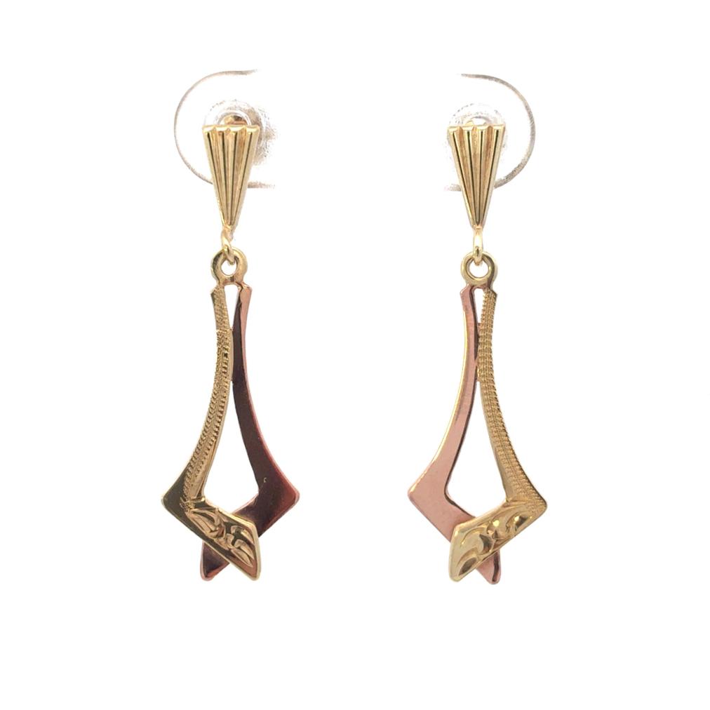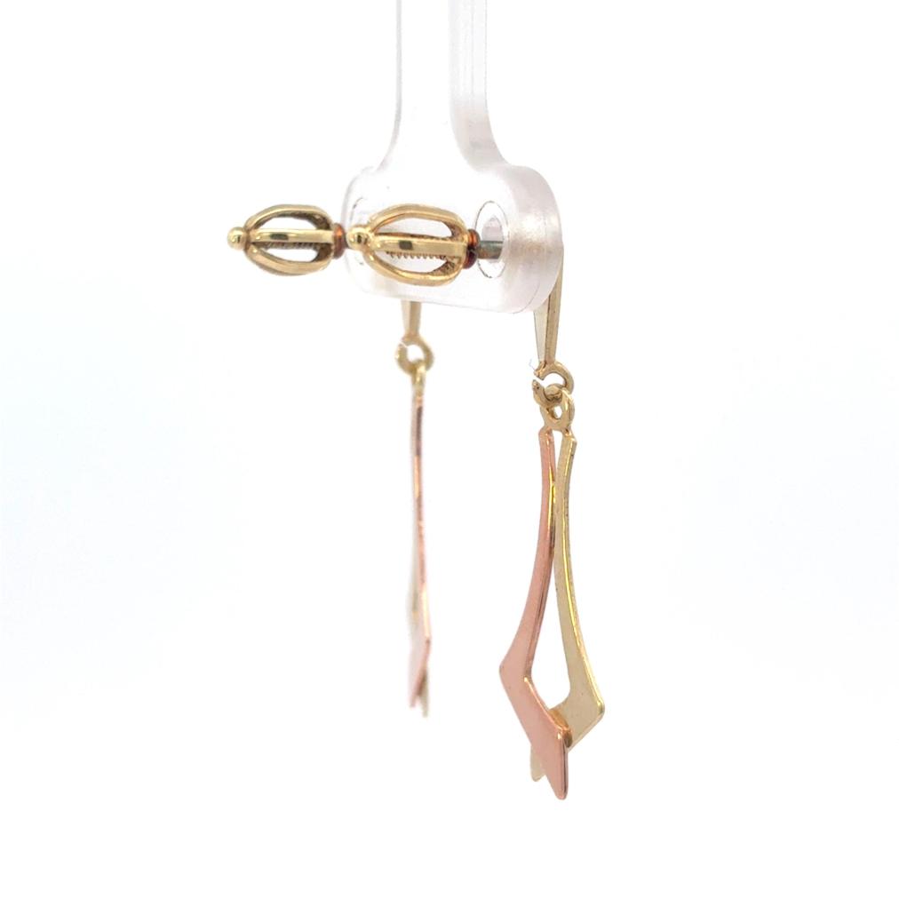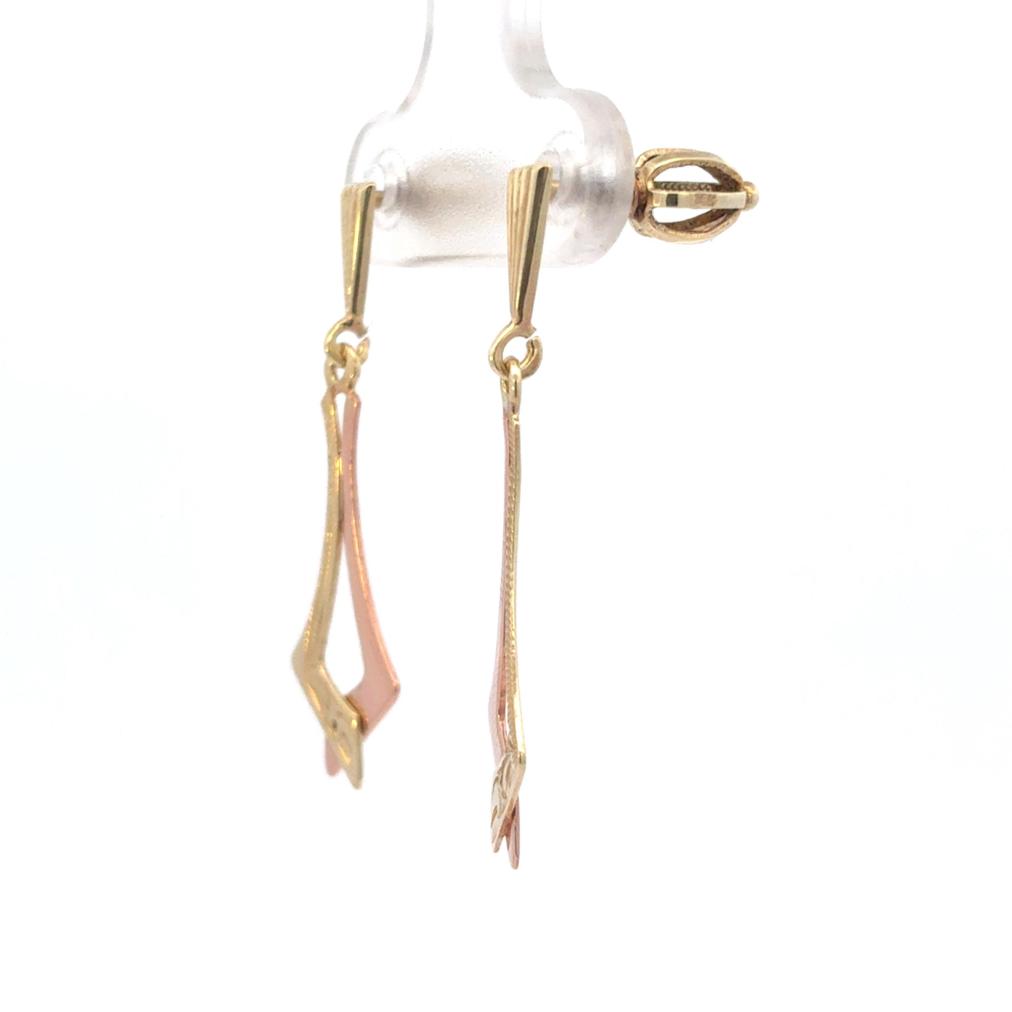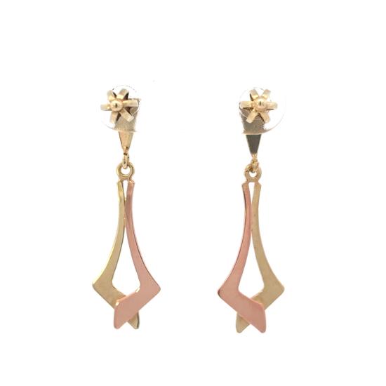 Náušnice z kombinace žlutého a růžového zlata o ryzosti 585/1000, punc labuť. Váha 1,94 g, výška 32 mm, v nejširším bodě 10 mm.