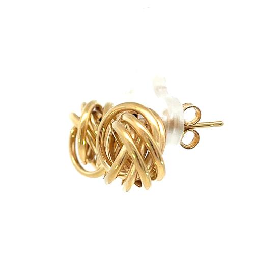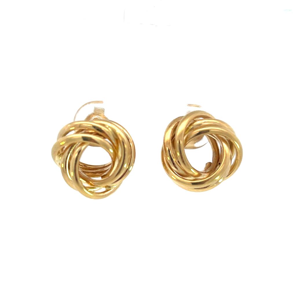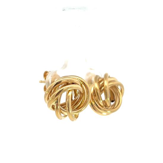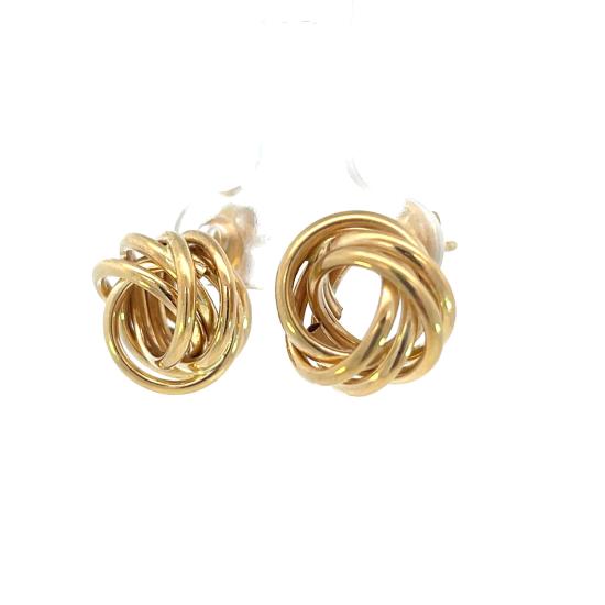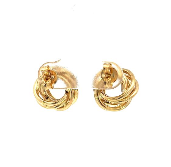 Zlaté náušnice o ryzosti 585/1000, punc labuť. Váha 3,45 g, průměr ozdoby 14 mm.