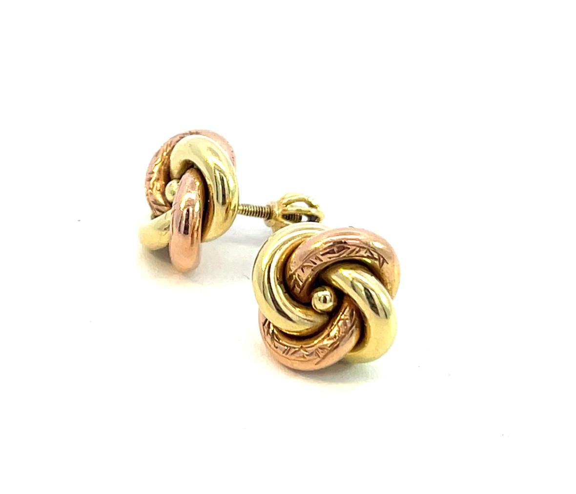 Náušnice z kombinace žlutého a růžového zlata o ryzosti 585/1000, punc čejka. Váha 3,79 g, průměr ozdoby 13 mm.