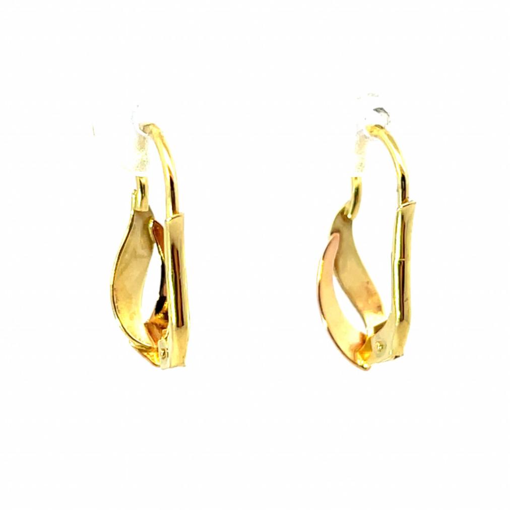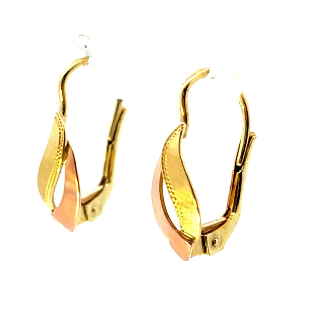 Elegantní zlaté náušnice s jemným gravírováním v kombinaci žlutého a růžového zlata o ryzosti 585/1000 s puncem labuť. Váha 1,50 g, celková délka 18 mm, v nejširším bodě měří 5 mm.