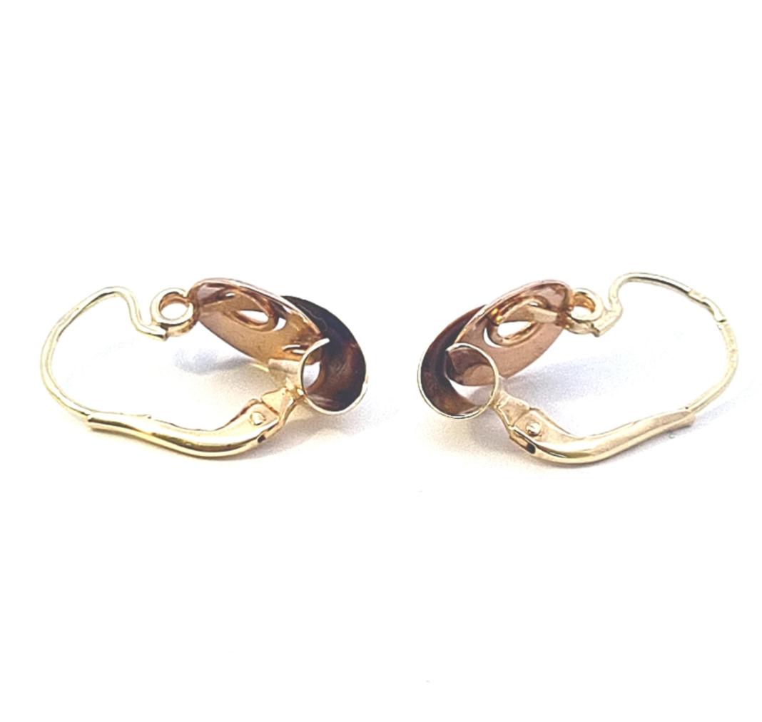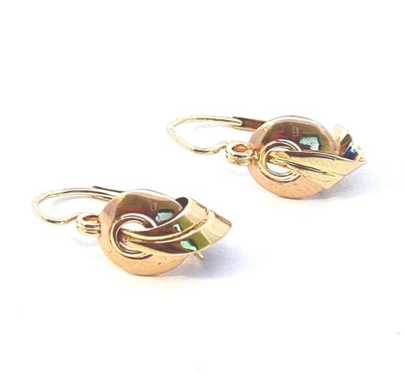 Náušnice z kombinace žlutého a růžového zlata o ryzosti 585/1000, punc čejka. Váha 2,25 g, výška 20 mm, v nejširším bodě 9 mm.