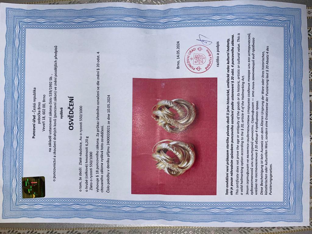 Zlaté náušnice o ryzosti 550/1000 o celkové hmotnosti 6,20 g. Výška náušnic 26 mm, rozměr ozdoby 22 x 19 mm. Přiložen certifikát z puncovního úřadu.