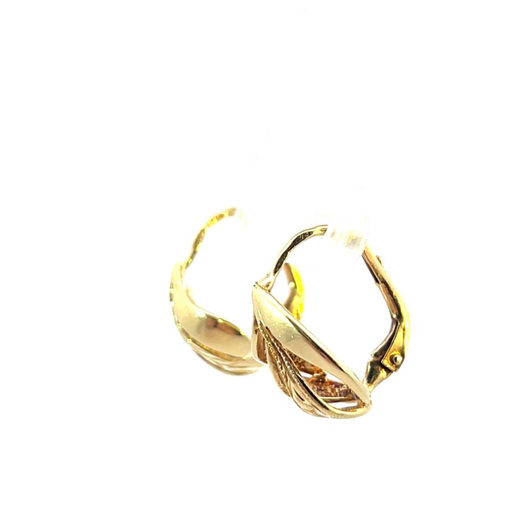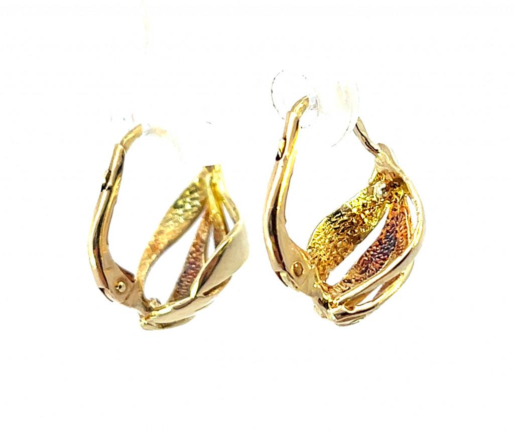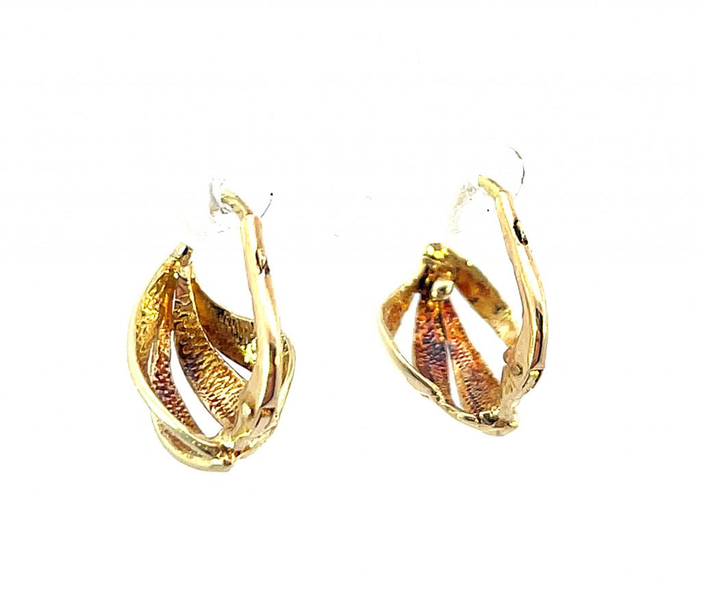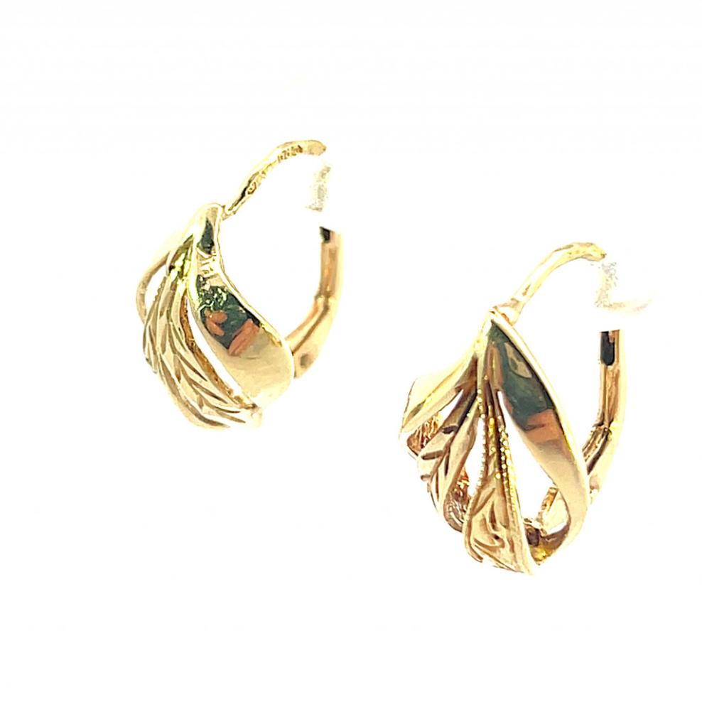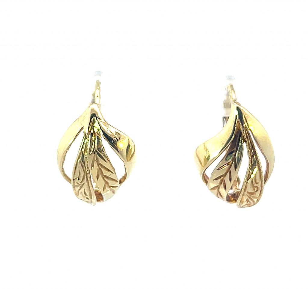 Zlaté náušnice o ryzosti 585/1000, punc čejka. Váha 2,62 g, výška 15 mm, v nejširším bodě 10 mm.