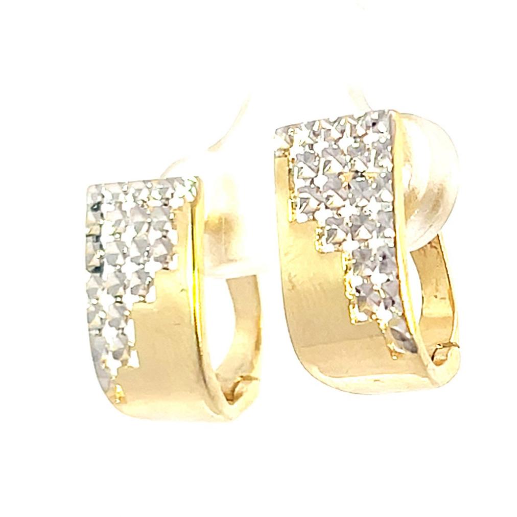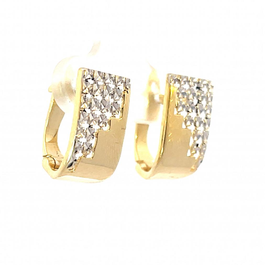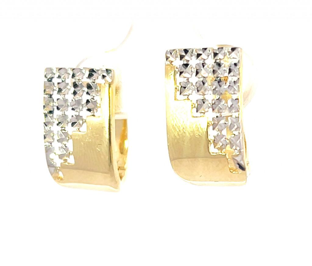 Náušnice z kombinace žlutého a bílého zlata o ryzosti 585/1000, punc labuť. Váha 3,18 g, výška 16 mm, v nejširším bodě 9,5 mm.