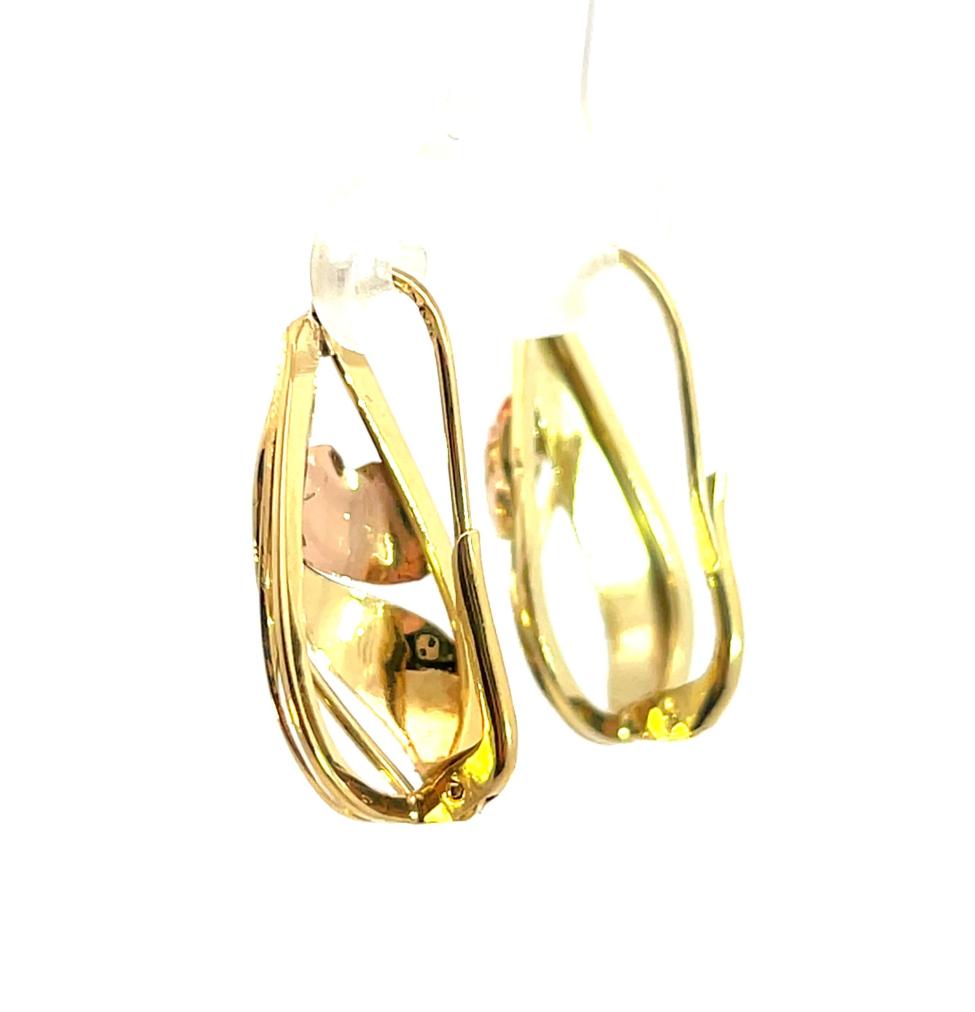 Náušnice z kombinace žlutého a růžového zlata o ryzosti 585/1000, punc čejka. Váha 5,16 g, výška 23 mm, v nejširším bodě 13 mm.