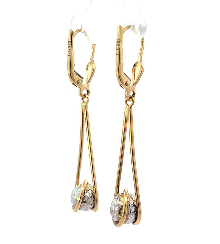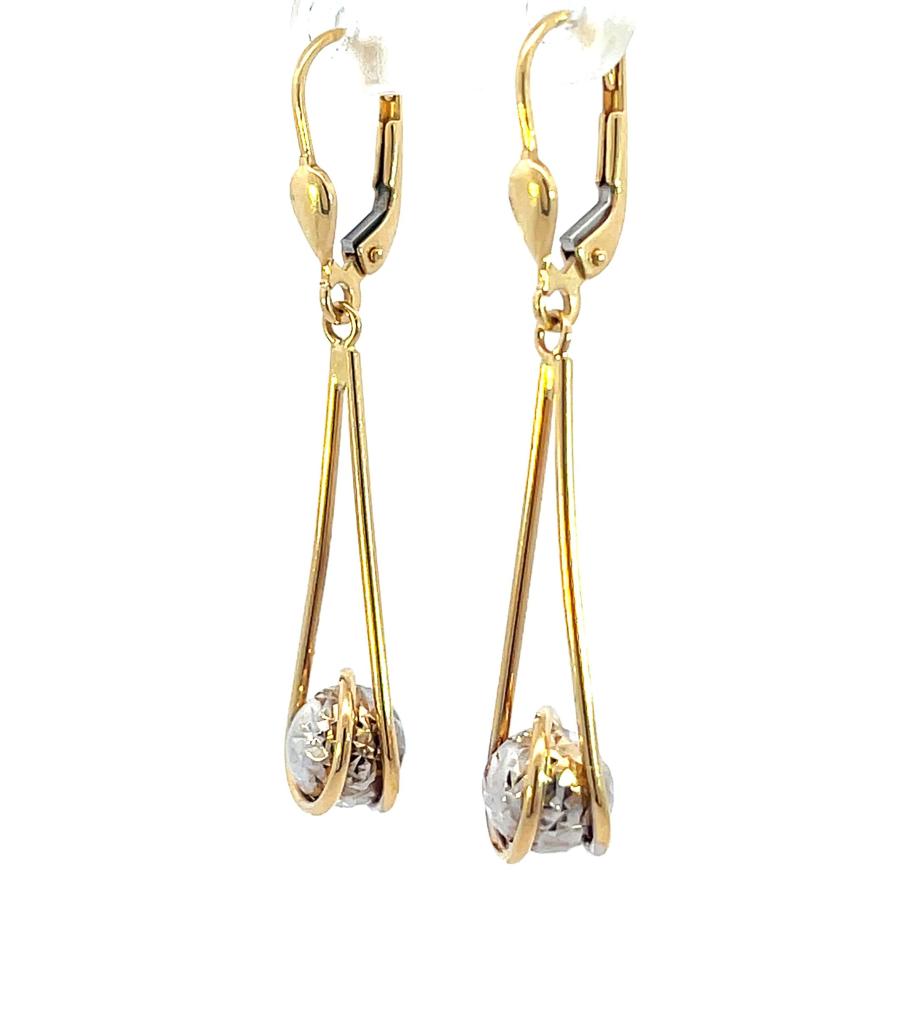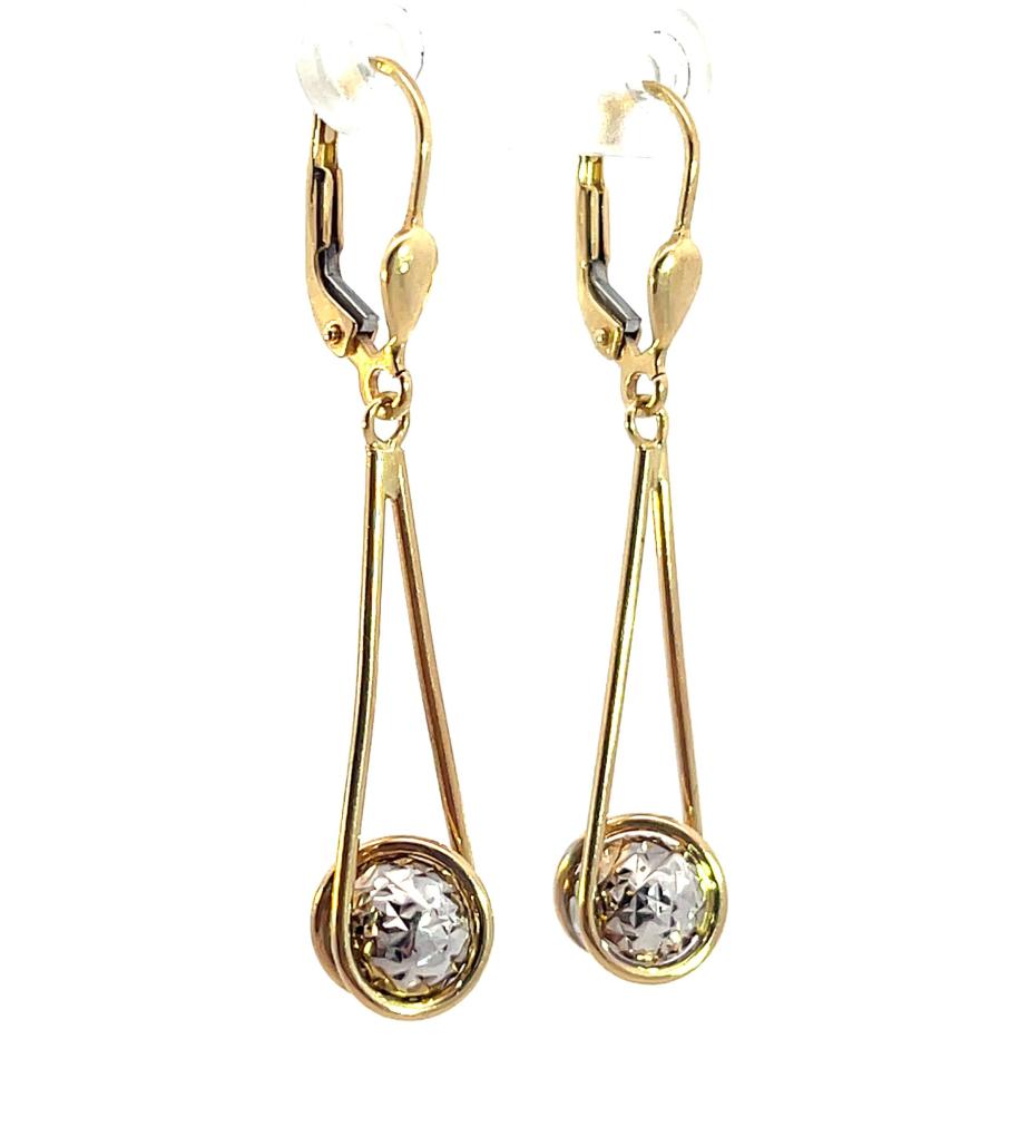 Náušnice z kombinace žlutého a bílého zlata o ryzosti 585/1000, punc labuť. Váha 2,71 g, výška 45 mm, v nejširším bodě 8 mm.