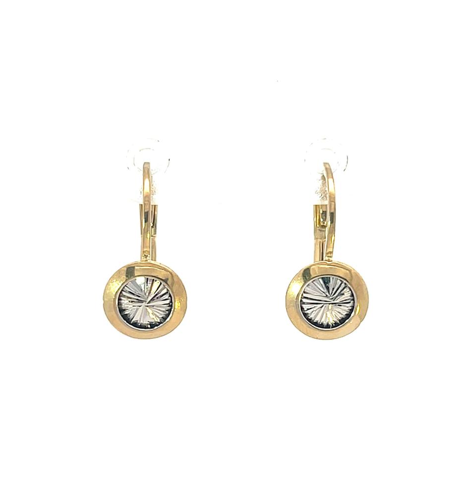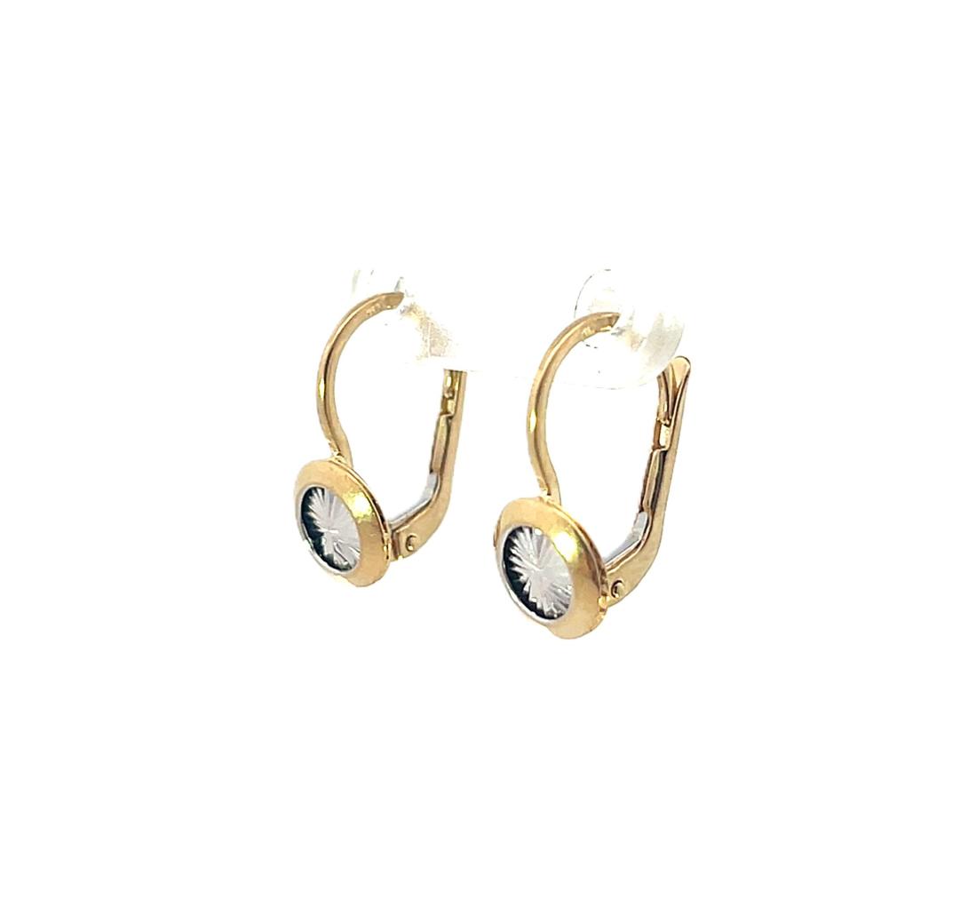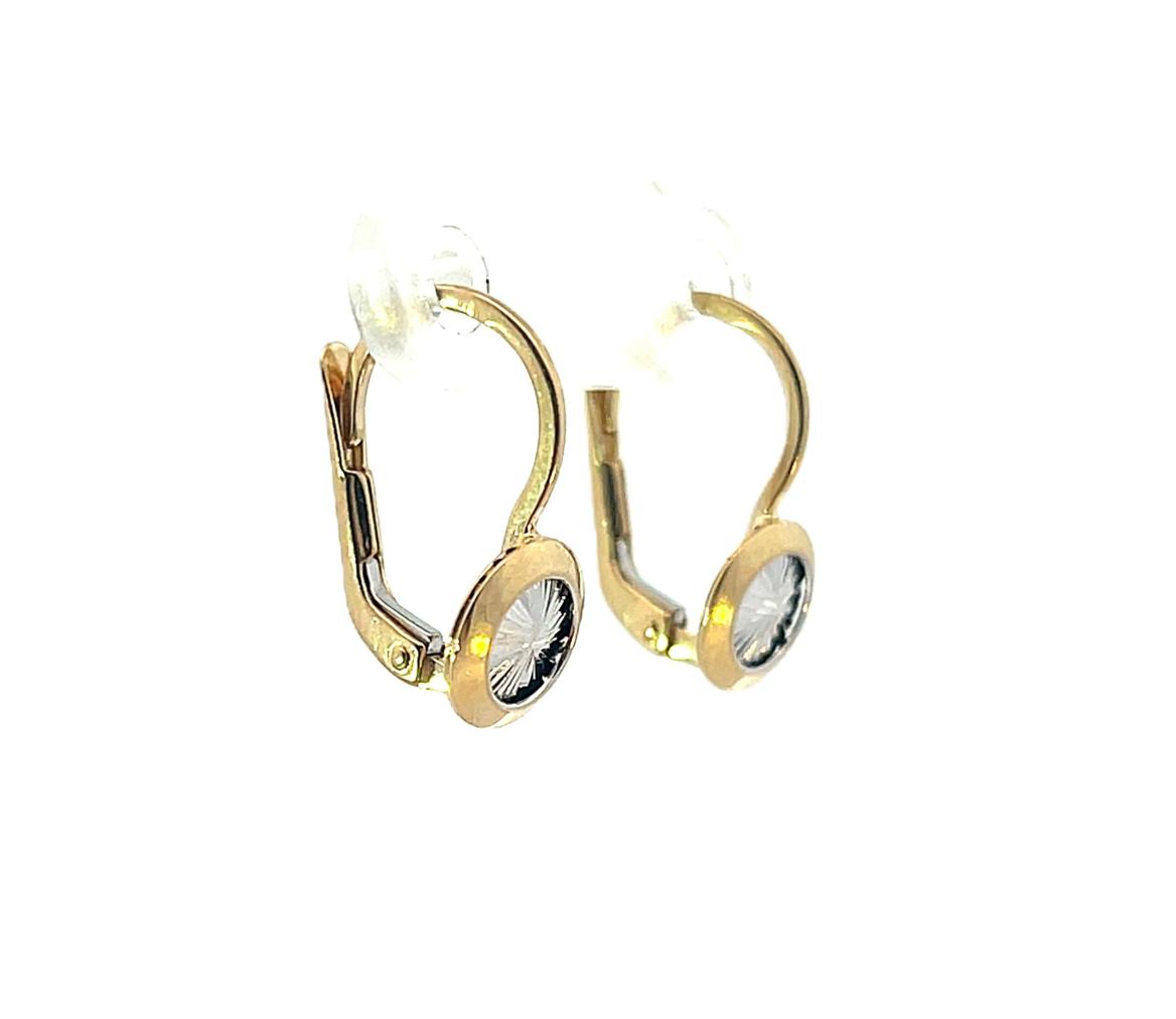 Náušnice z kombinace žlutého a bílého zlata o ryzosti 585/1000, punc labuť. Váha 1,69 g, výška 17 mm, průměr 8 mm.