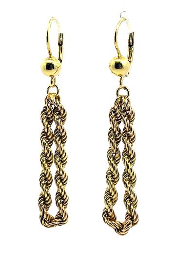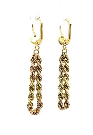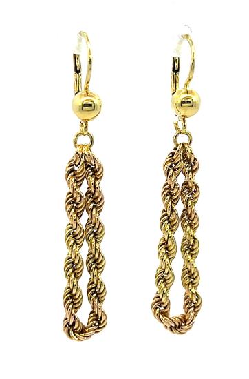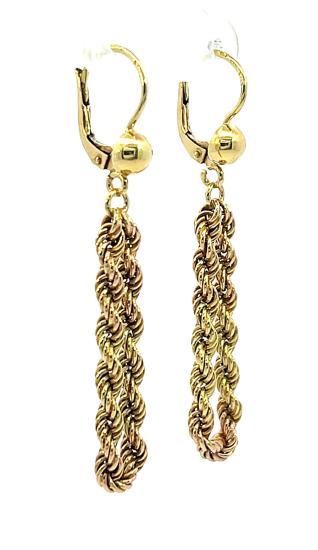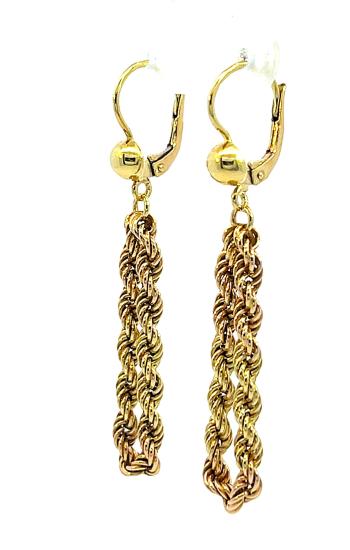 Náušnice z kombinace žlutého a růžového zlata o ryzosti 585/1000, punc labuť. Váha 3,79 g, výška 50 mm, v nejširším bodě 9 mm.