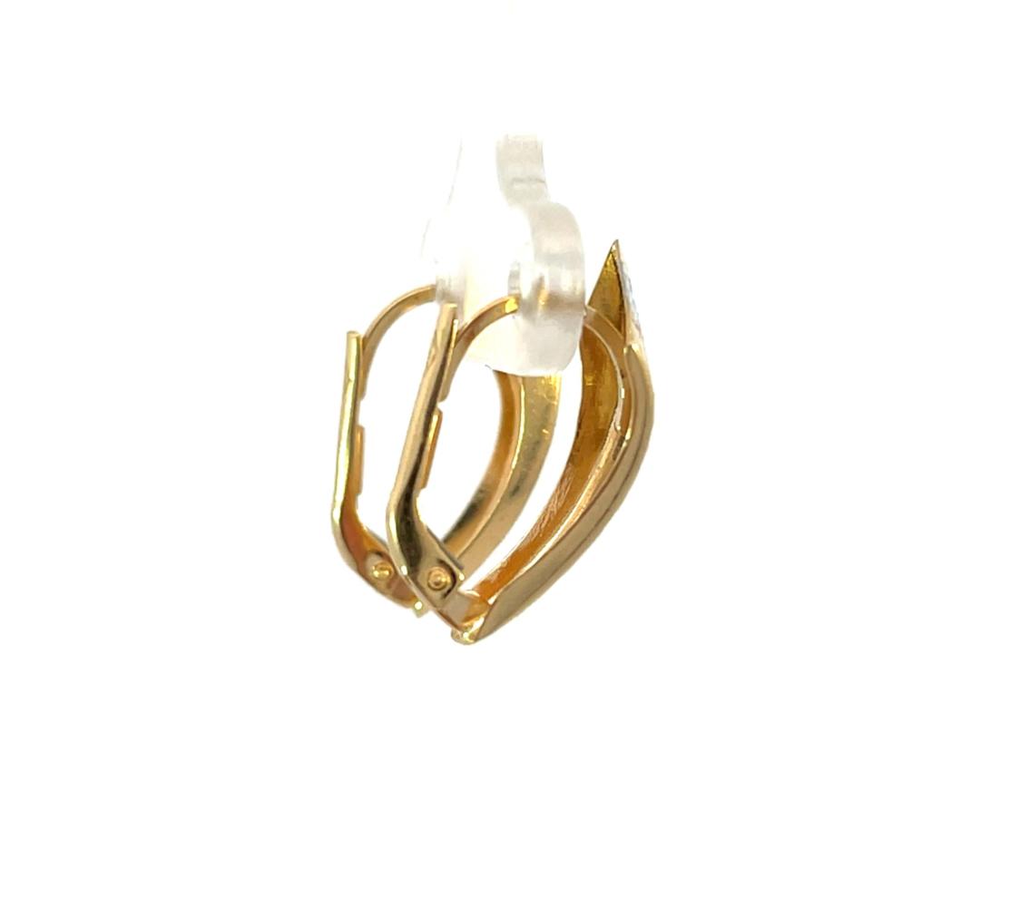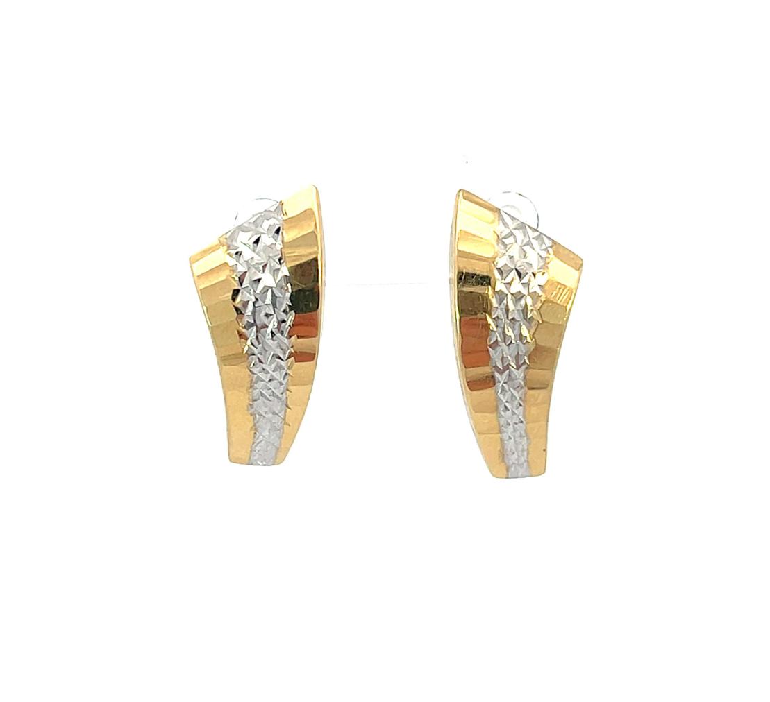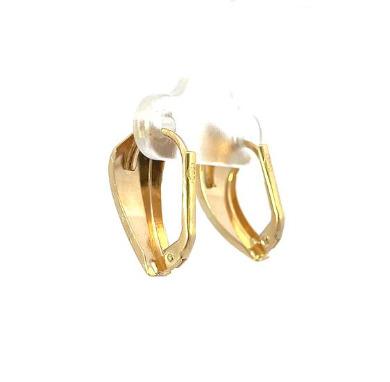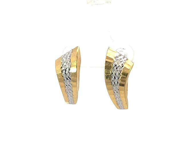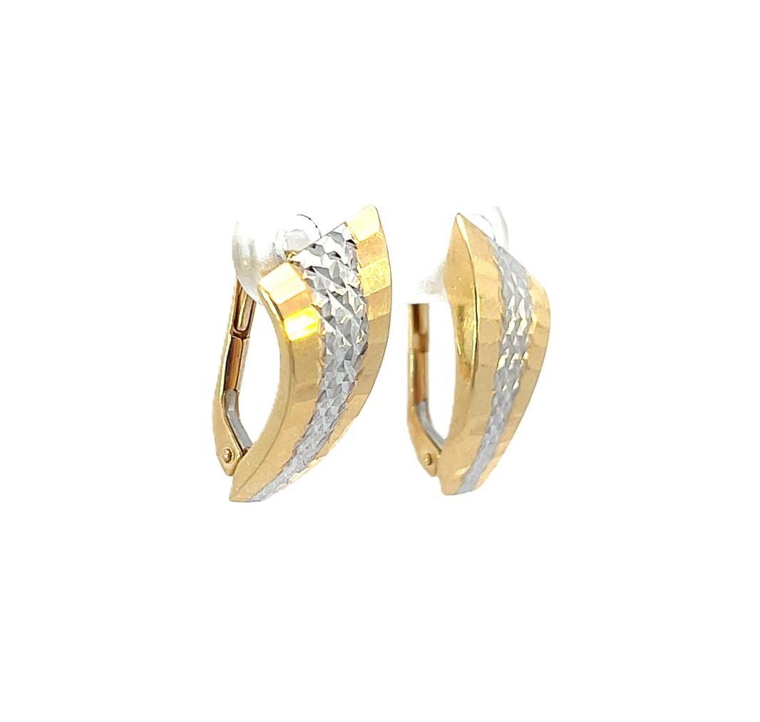 Náušnice z kombinace žlutého a bílého zlata o ryzosti 585/1000, punc labuť. Váha 1,80 g, výška 21 mm, v nejširším bodě 10 mm.