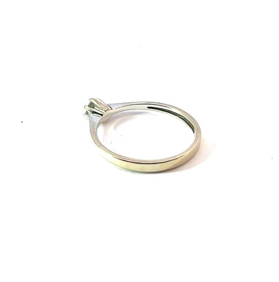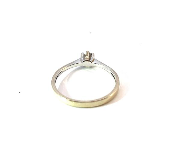Prsten z bílého zlata o ryzosti 585/1000, punc labuť. Velikost 54, váha 1,60 g, v nejširším bodě 4,5 mm. Kámen - přírodní diamant briliantového brusu - 1 ks, cca 0,10 ct.