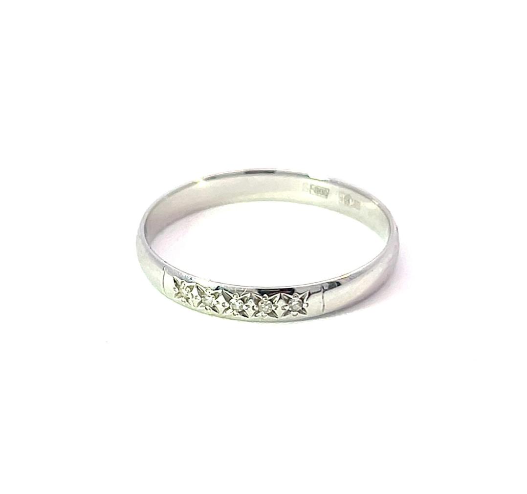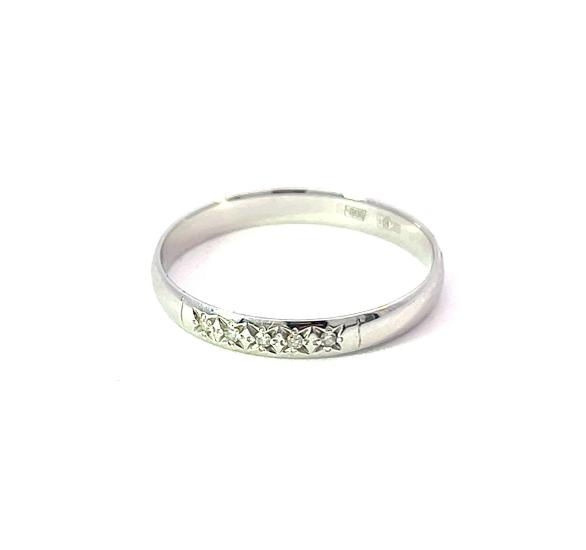 Zlatý prsten o ryzosti 585/1000, punc labuť, váha 1,71 g, velikost 59,5, v nejširším bodě 3 mm. Kámen - diamant briliantového brusu, celkem 5 ks, cca 0,05 ct.