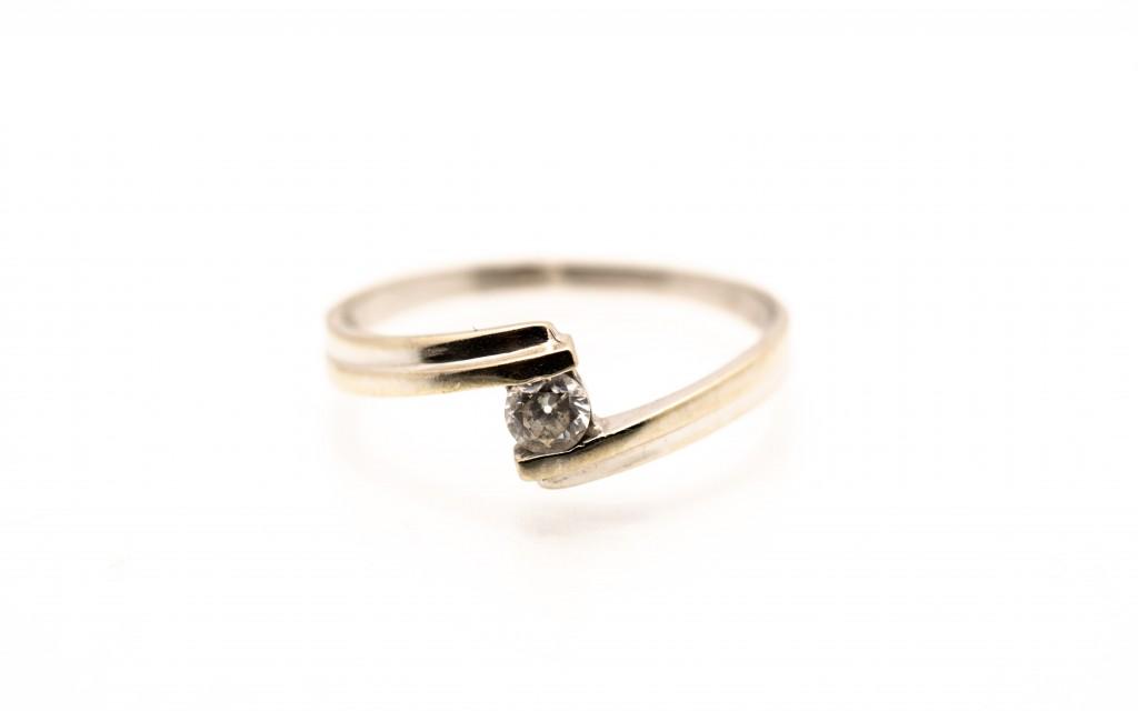 Zlatý prsten o ryzosti 585/1000, punc labuť, váha 1,30 g, velikost 53, v nejširším bodě 5 mm, průměr kamene 3 mm.
