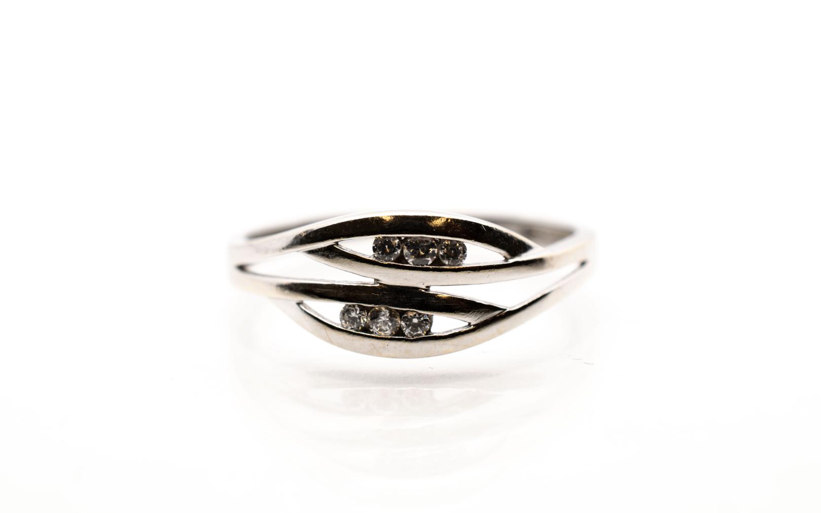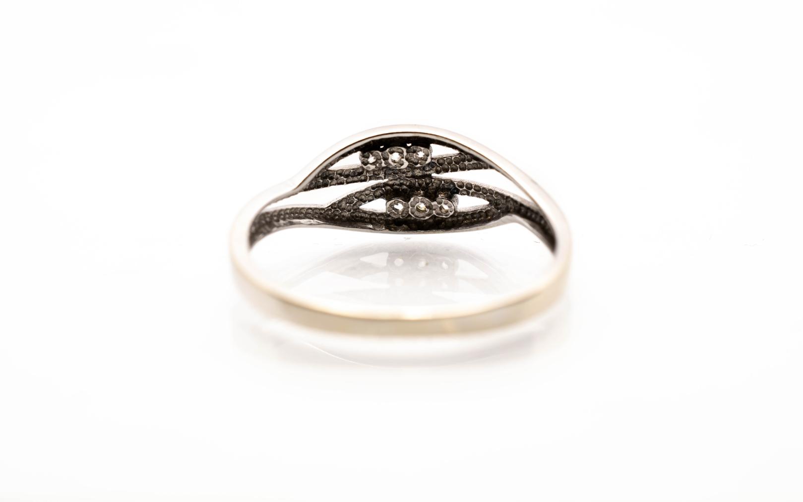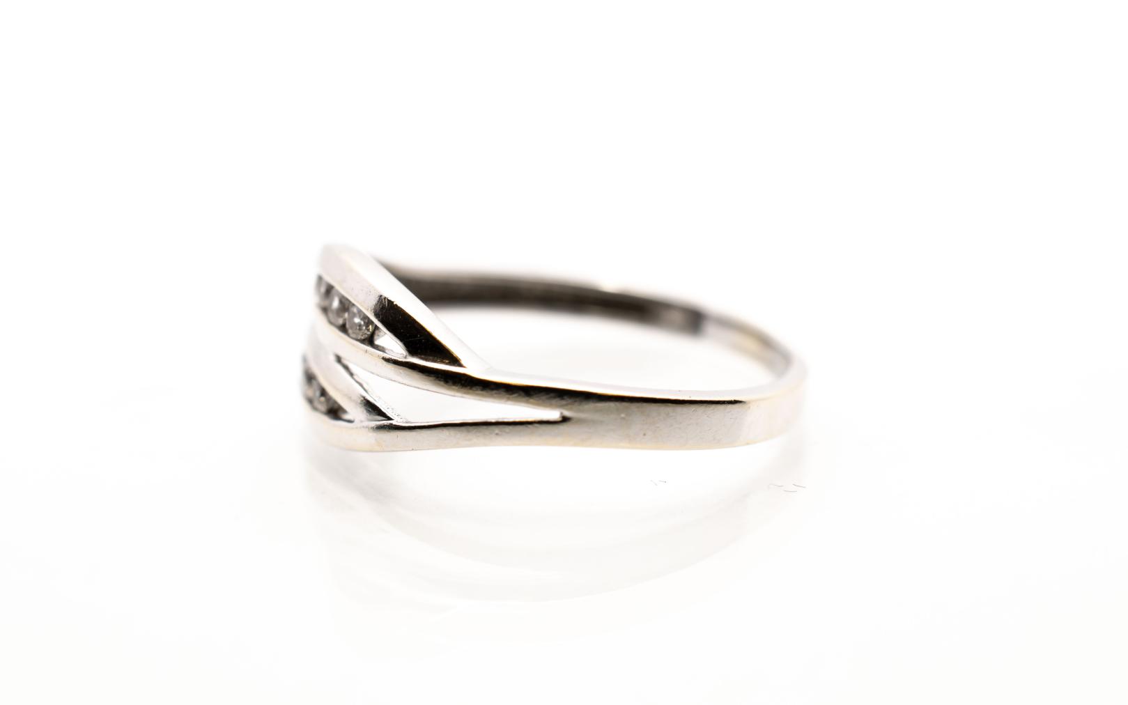 Zlatý prstenů bílého zlata o ryzosti 585/1000, punc labuť, váha 1,86 g, velikost 59, v nejširším bodě 8 mm.