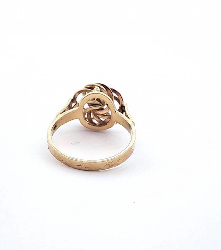 Prsten z kombinace žlutého a růžového zlata o ryzosti 585/1000 s puncem čejky. Jemné kroužky spletené do růžice tvoří hlavu prstenu. Rozměry hlavy prstenu jsou 11 x 11 cm. Velikost prstenu je 50,5. Prsten váží 2,64 g.